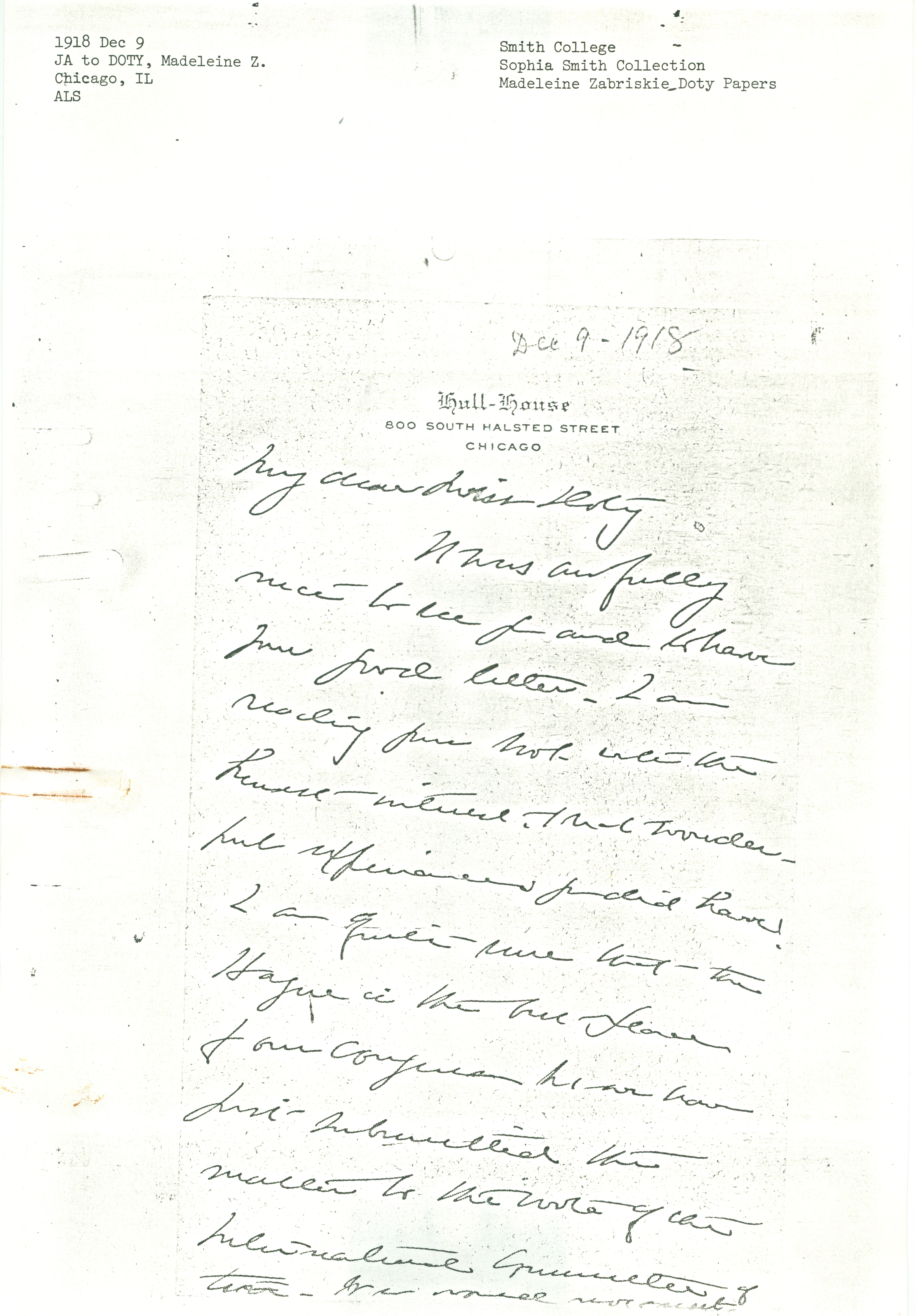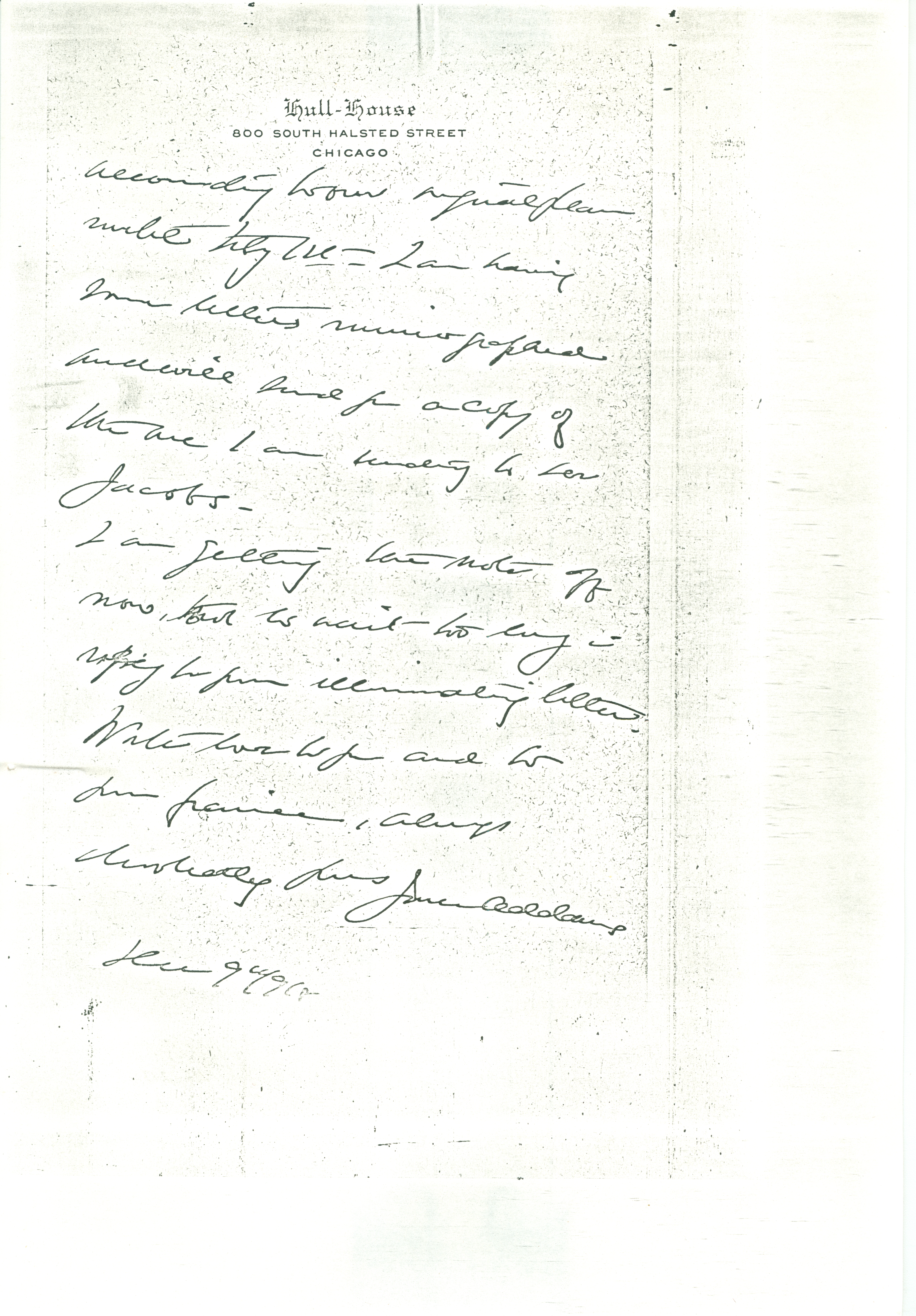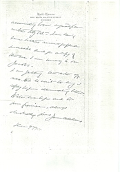 It was awfully nice to see you and to have your good letter. I am reading your book with the [kindest] interest. What wonderful experiences you did have! I am quite sure that The Hague is the best place for our Congress but we have just submitted the matter to the vote of the International Committee of [five?]. We would [illegible] [page 2] according to our original plan until Feby 1st. I am having some letters mimeographed and will send you a copy of the one I am sending Dr Jacobs.