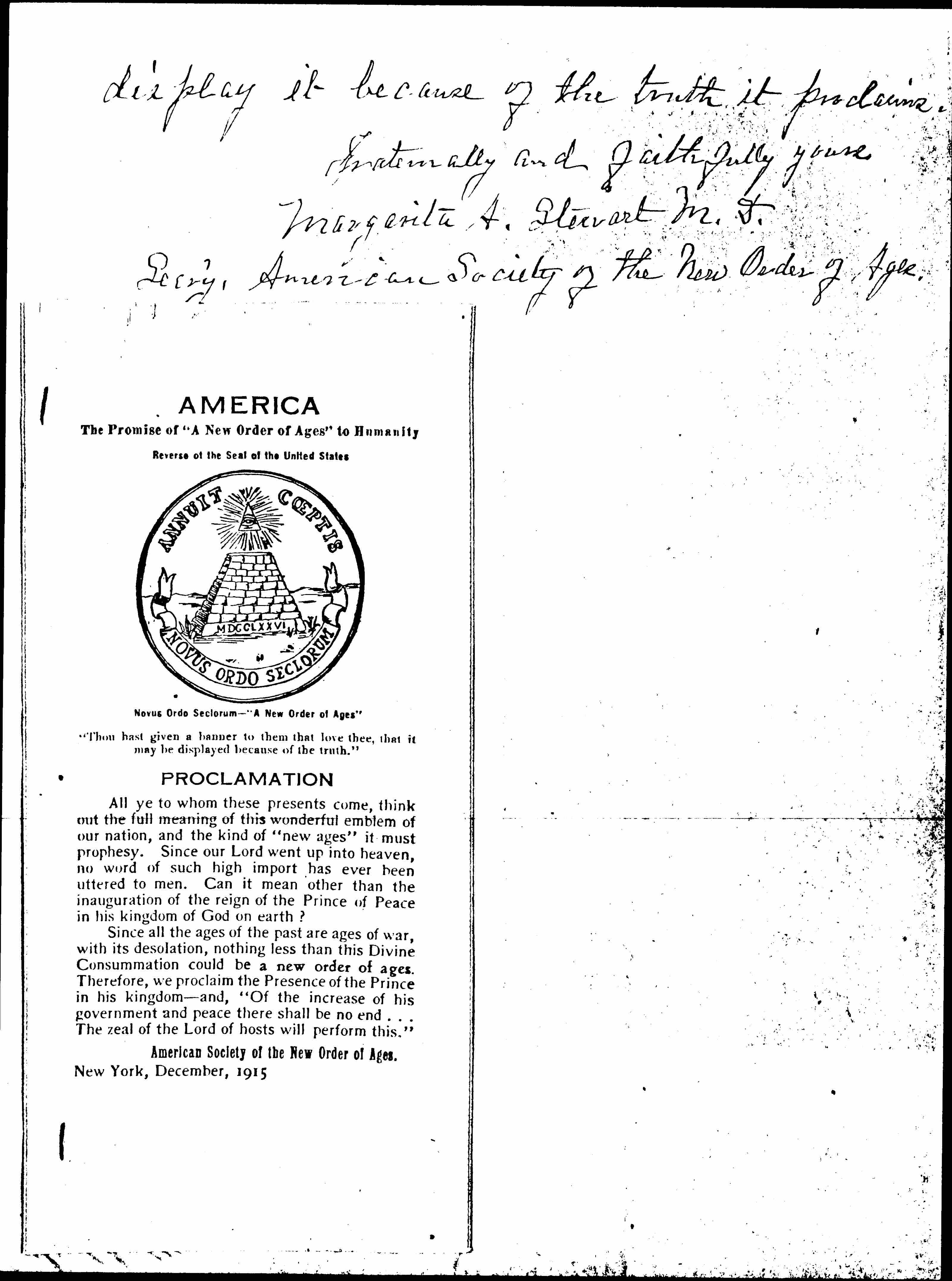 All ye to whom these presents come, think out the full meaning of this wonderful emblem of our nation, and the kind of "new ages" it must prophesy. Since our Lord went up into heaven, no word of such high import has ever been uttered to men. Can it mean other than the inauguration of the reign of the Prince of Peace in his kingdom of God on earth?