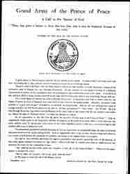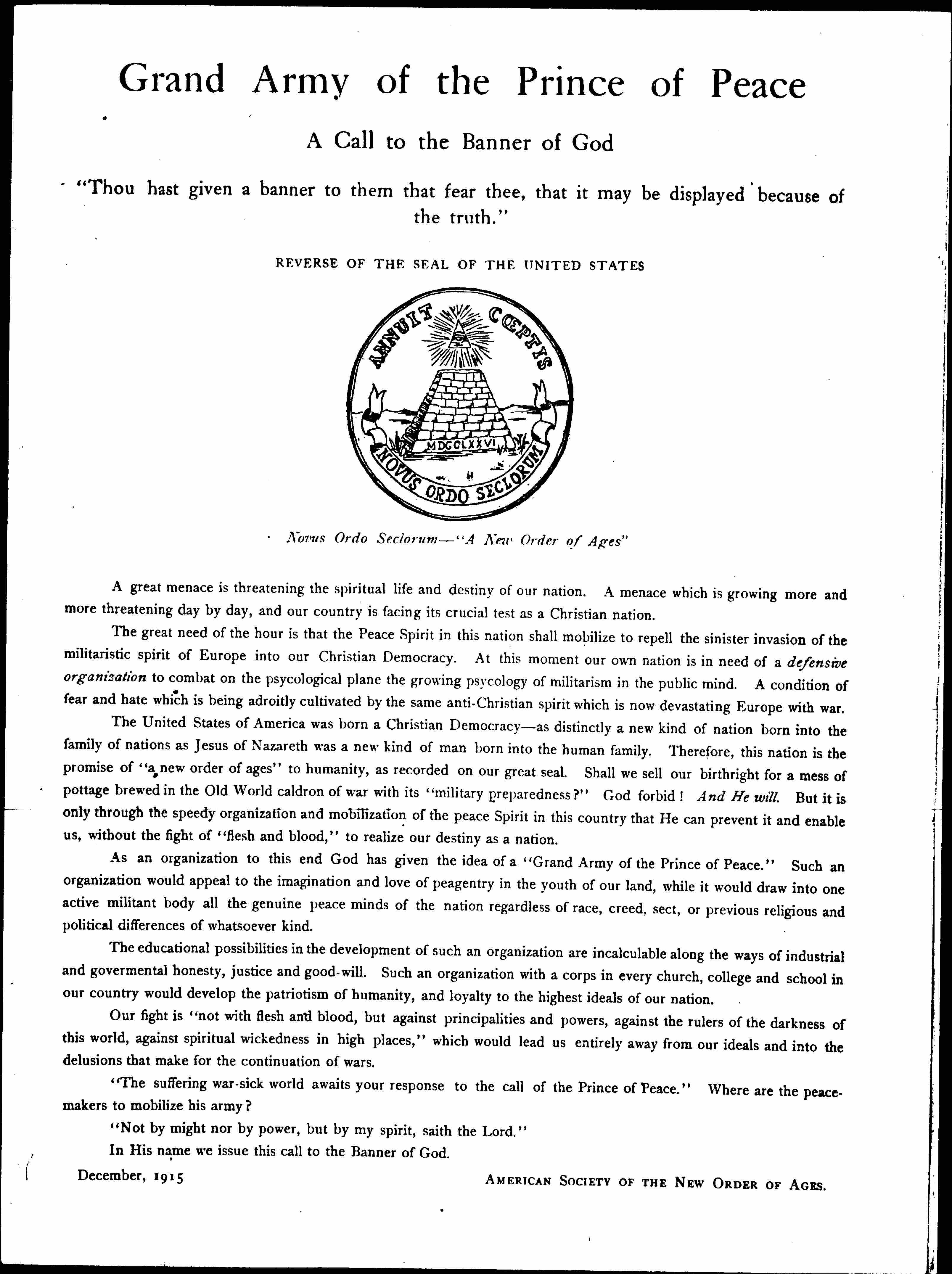 As an organization to this end God has given the idea of a "Grand Army of the Prince of Peace." Such an organization would appeal to the imagination and love of [pageantry] in the youth of our land, while it would draw into one active militant body all the genuine peace minds of the nation regardless of race, creed, sect, or previous religious and political differences of whatsoever kind.