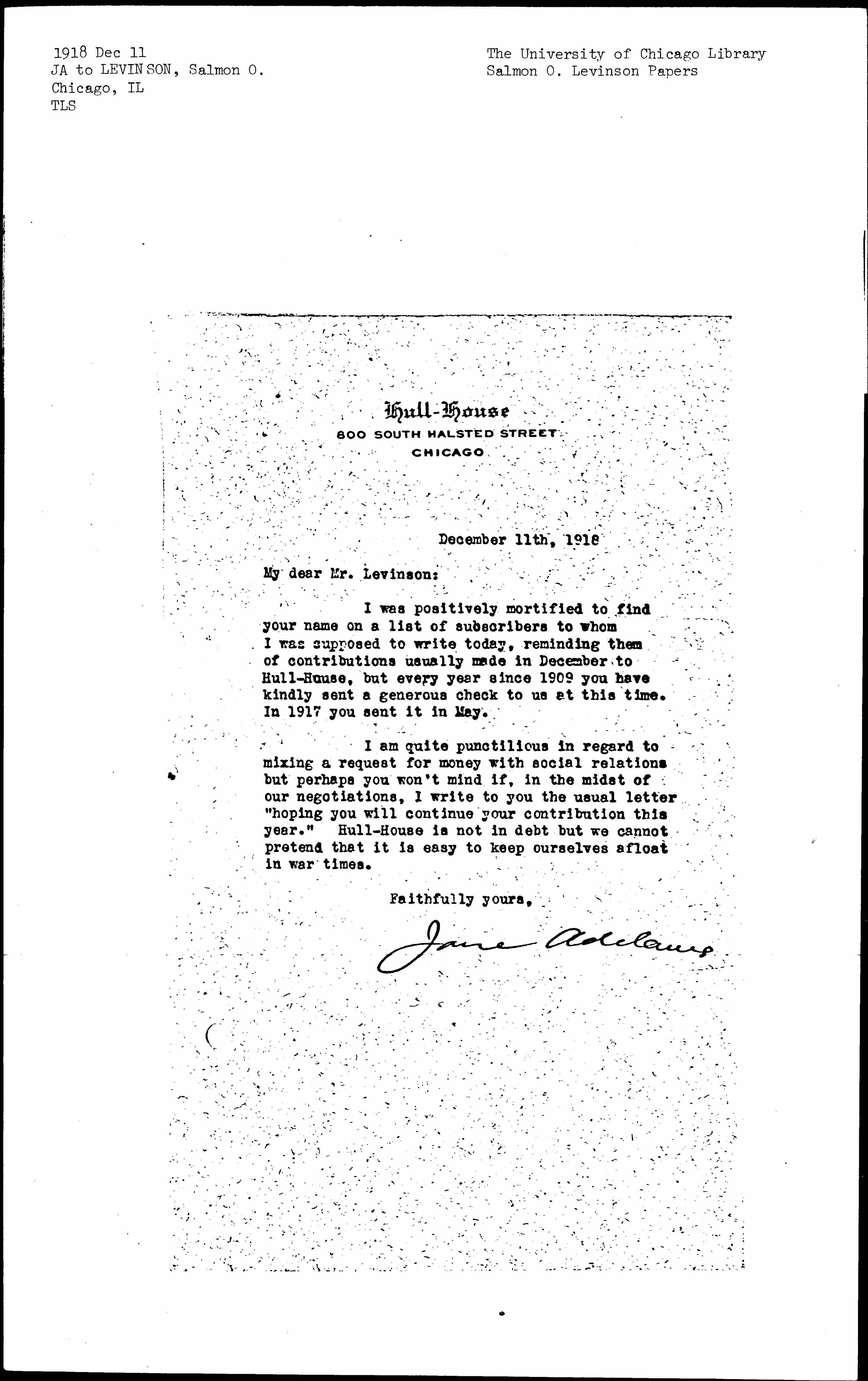 I am quite punctilious in regard to mixing a request for money with social relations but perhaps you won't mind if, in the midst of our negotiations, I write to you the usual letter "hoping you will continue your contribution this year." Hull-House is not in debt but we cannot pretend that it is easy to keep ourselves afloat in war times.
