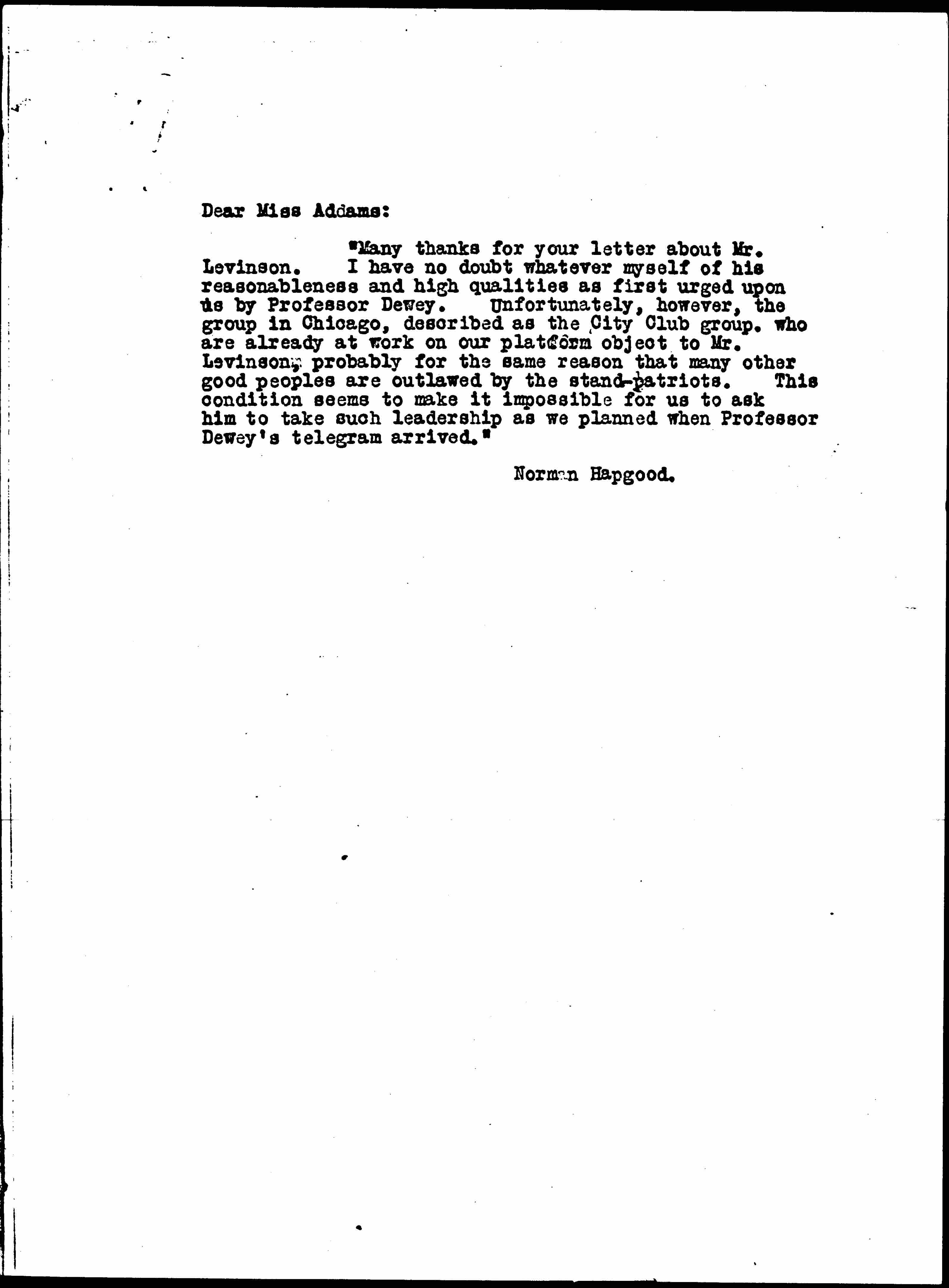 "Many thanks for your letter about Mr. Levinson. I have no doubt whatever myself of his reasonableness and high qualities as first urged upon us by Professor Dewey. Unfortunately, however, the group in Chicago, described as the City Club group, who are already at work on our platform object to Mr. Levinson, probably for the same reason that many other good peoples are outlawed by the stand-patriots. This condition seems to make it impossible for us to ask him to take such leadership as we planned when Professor Dewey's telegram arrived."