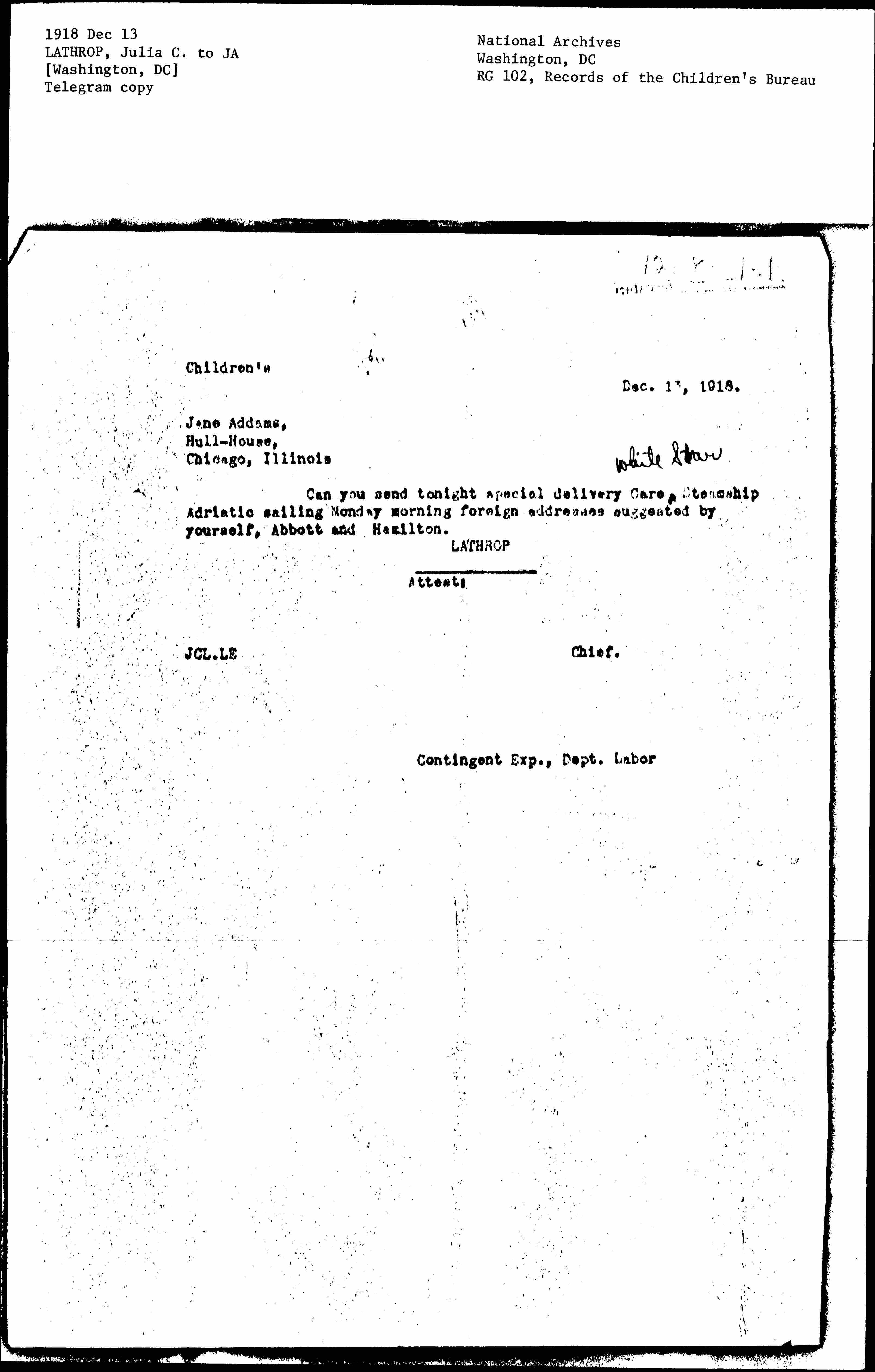 Can you send tonight special delivery Care ↑White Star↓ Steamship Adriatic sailing Monday morning foreign addresses suggested by yourself, Abbott and Hamilton.