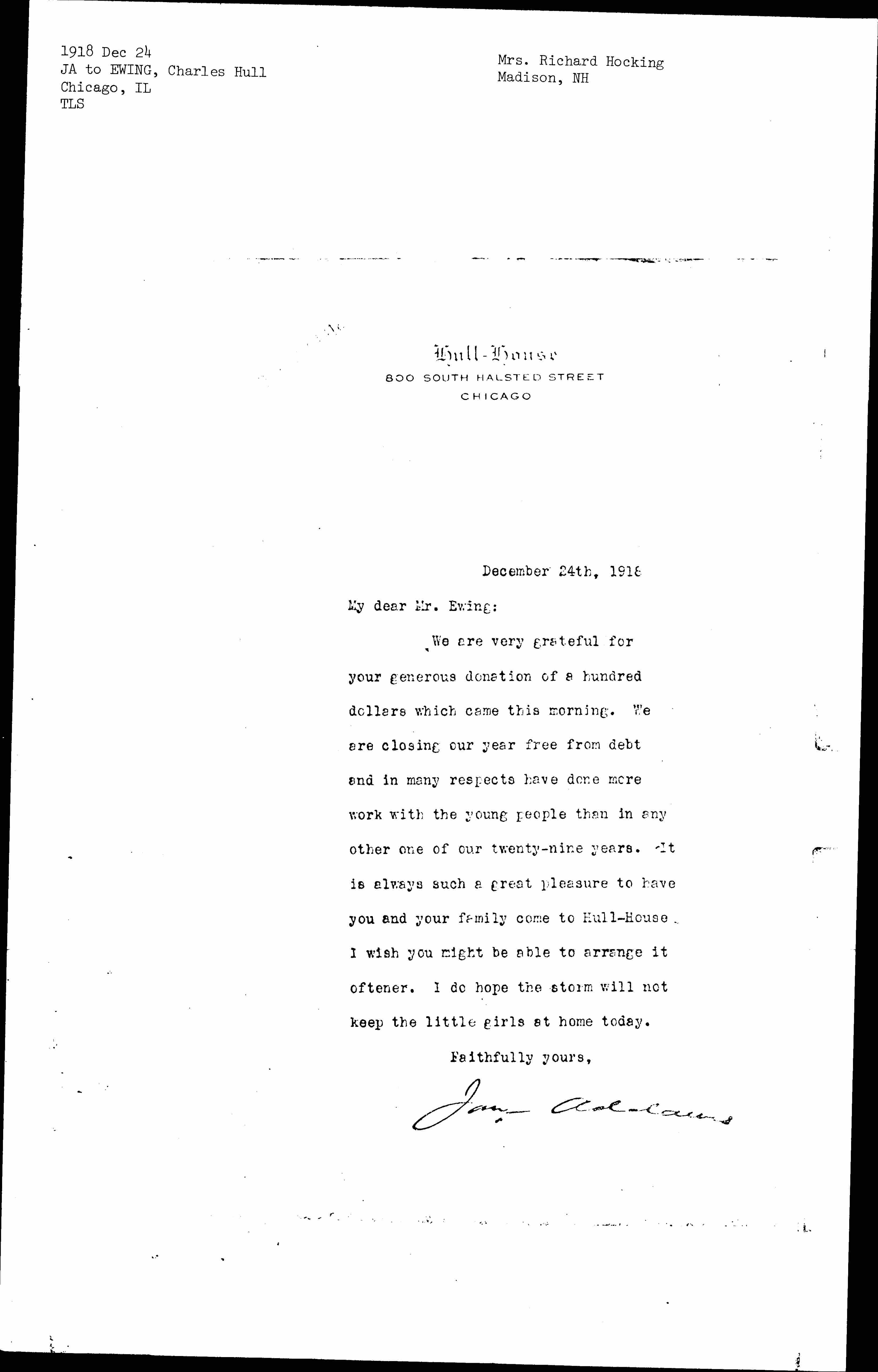 We are very grateful for your generous donation of a hundred dollars which came this morning. We are closing our year free from debt and in many respects have done more work with the young people than in any other one of our twenty-nine years. It is always such a great pleasure to have you and your family come to Hull-House. I wish you might be able to arrange it oftener. I do hope the storm will not keep the little girls at home today.