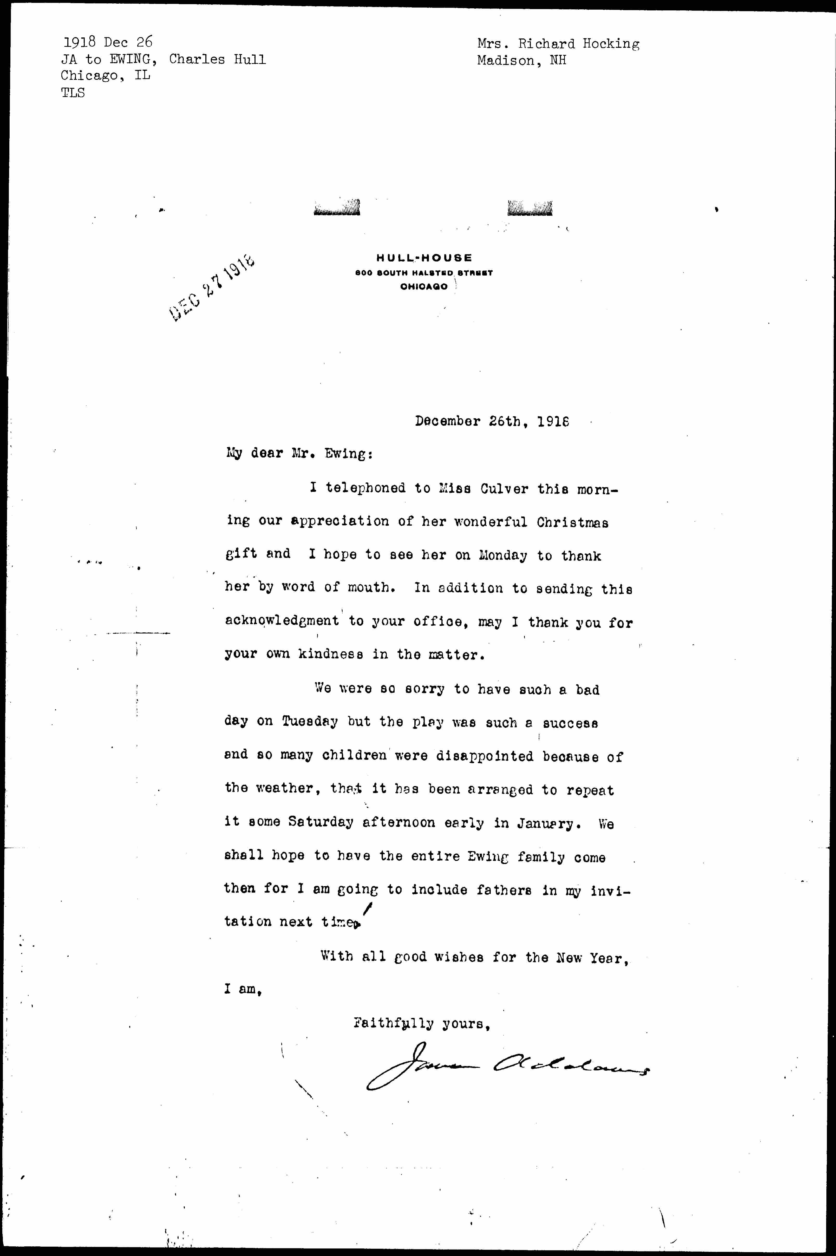We were so sorry to have such a bad day on Tuesday but the play was such a success and so many children were disappointed because of the weather, that it has been arranged to repeat it some Saturday afternoon early in January. We shall hope to have the entire Ewing family come then for I am going to include fathers in my invitation next time!