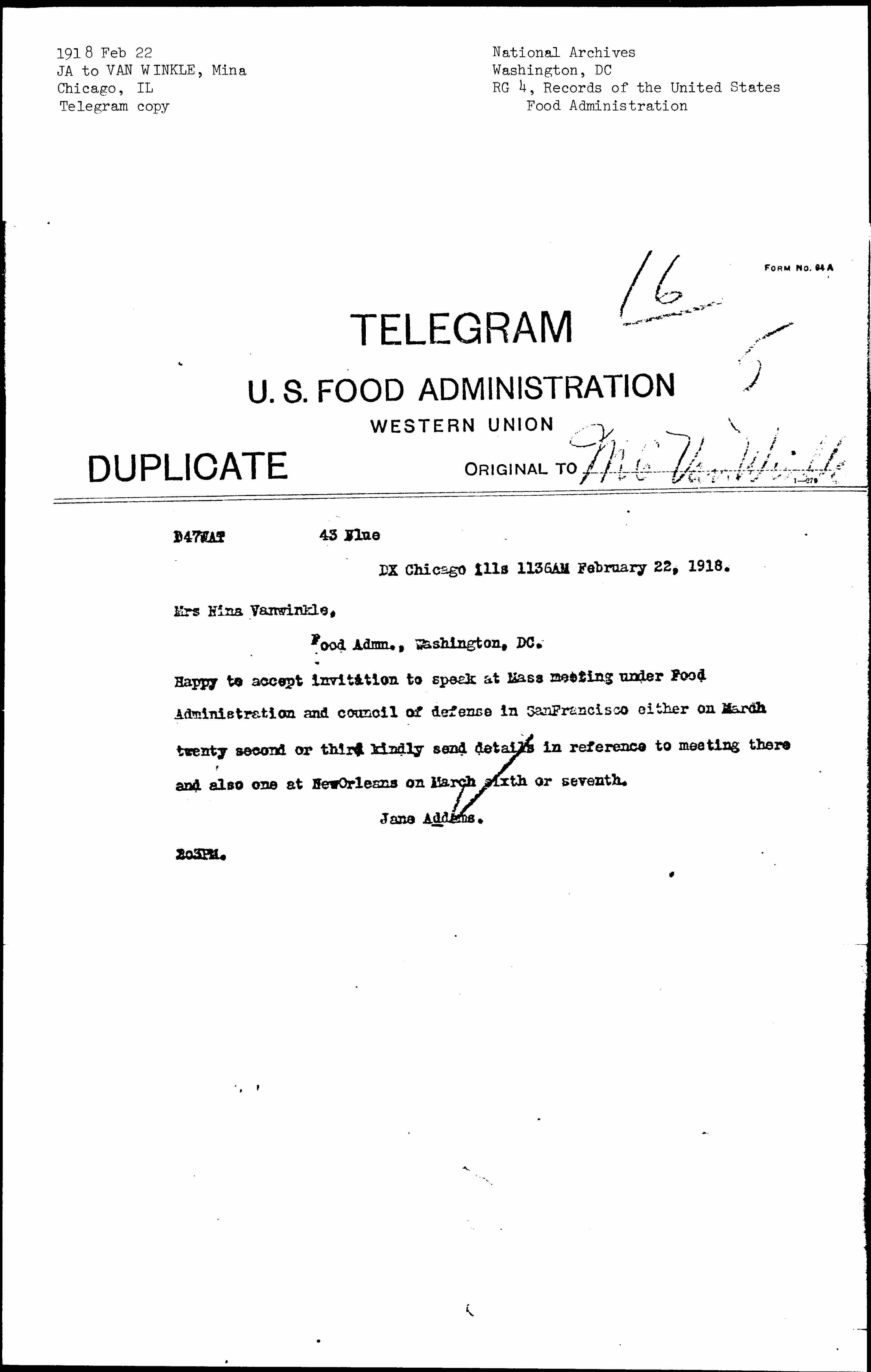 Happy to accept invitation to speak at Mass meeting under Food Administration and council of defense in San Francisco either on March twenty second or third kindly send details in reference to meeting there and also one at New Orleans on March sixth or seventh.