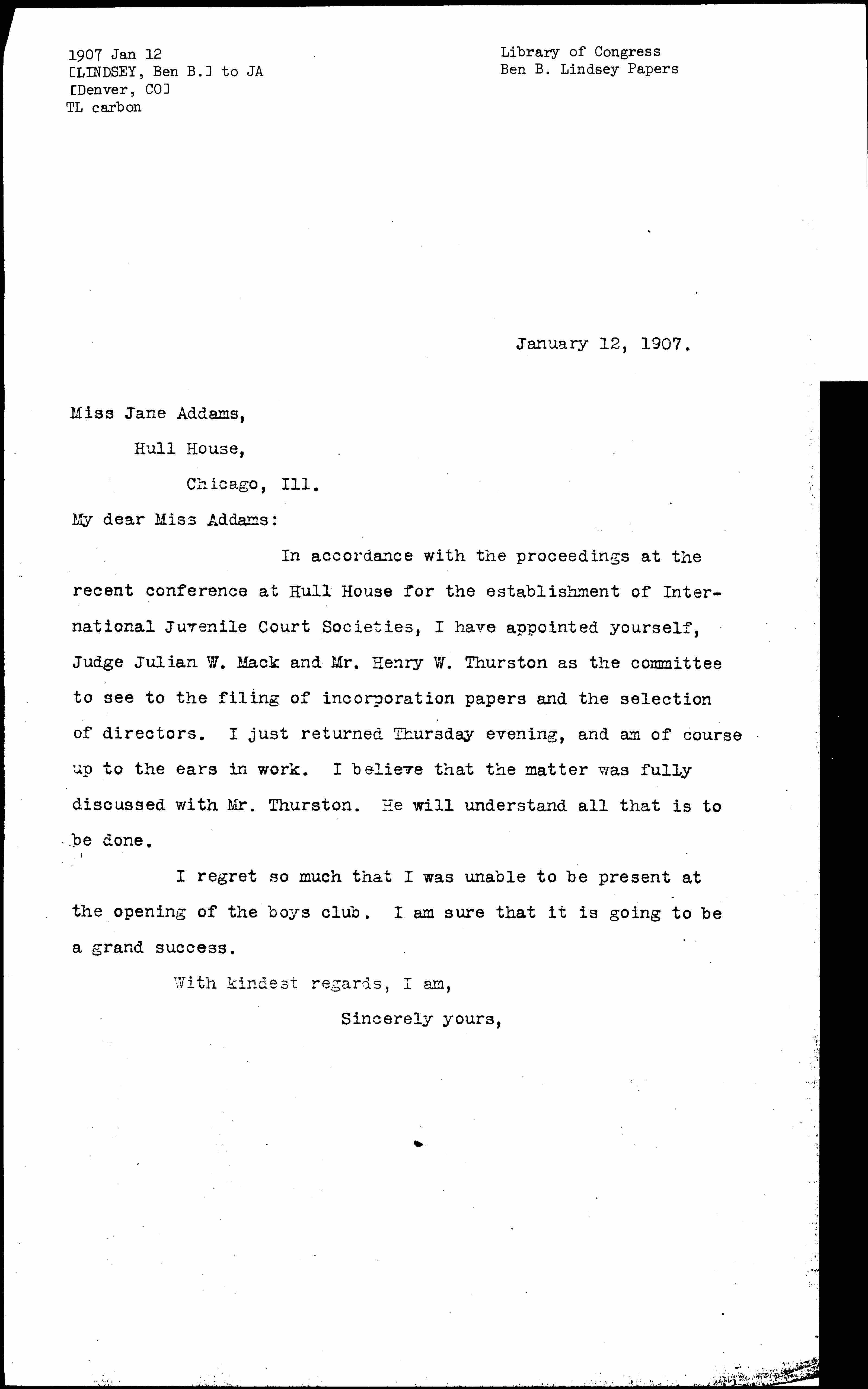 In accordance with the proceedings at the recent conference at Hull House for the establishment of International Juvenile Court Societies, I have appointed yourself, Judge Julian W. Mack and Mr. Henry W. Thurston as the committee to see to the filling of incorporation papers and the selection of directors. I just returned Thursday evening, and am of course up to the ears in work. I believe that the matter was fully discussed with Mr. Thurston. He will understand all that is to be done.