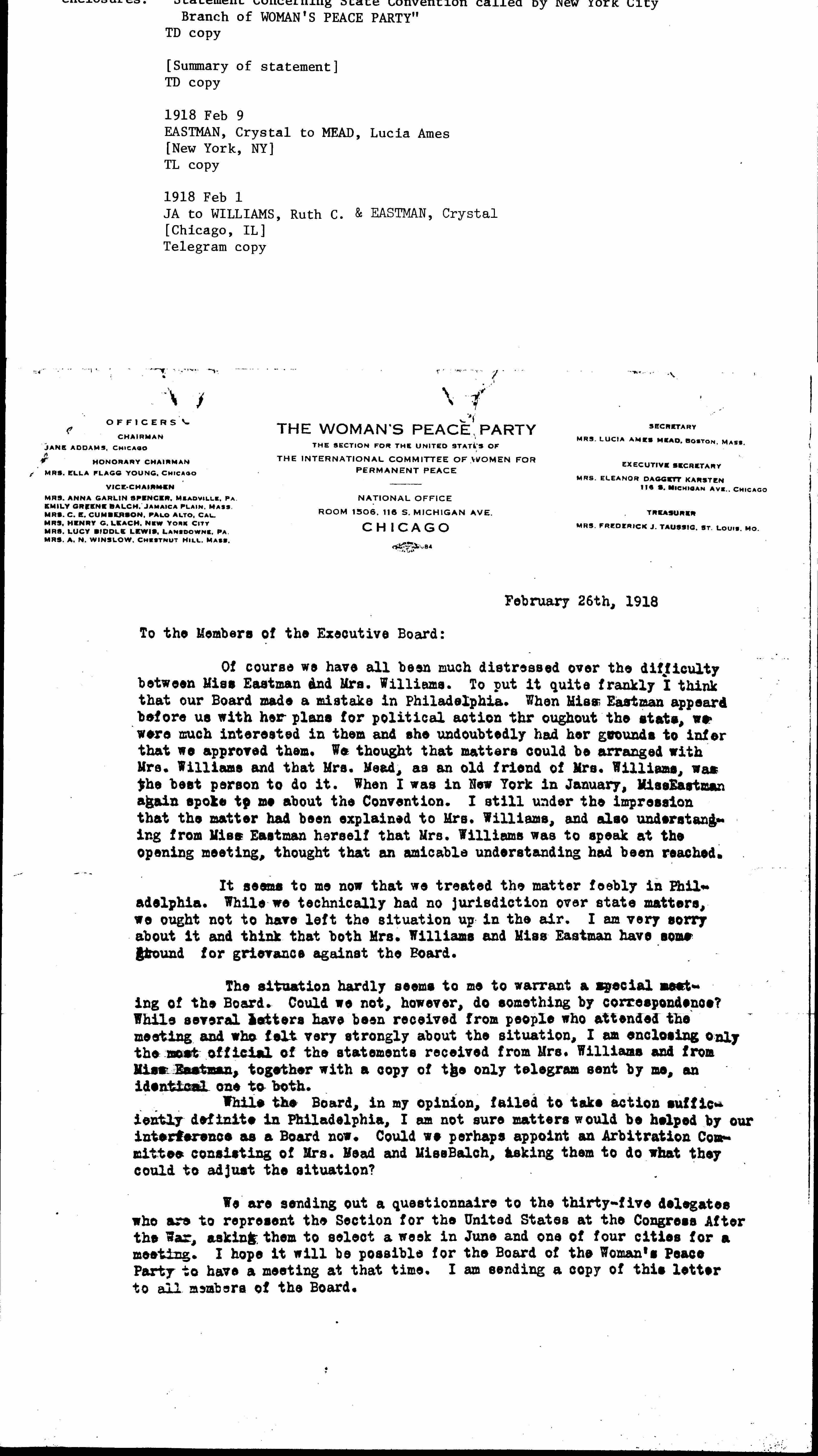 Of course we have all been much distressed over the difficulty between Miss Eastman and Mrs. Williams. To put it quite frankly I think that our Board made a mistake in Philadelphia. When Miss Eastman [appeared] before us with her plans for political action throughout the state, we were much interested in them and she undoubtedly had her grounds to infer that we approved them. We thought that matters could be arranged with Mrs. Williams and that Mrs. Mead, as an old friend of Mrs. Williams, was the best person to do it. When I was in New York in January, Miss Eastman again spoke to me about the Convention. I still under the impression that the matter had been explained to Mrs. Williams, and also understanding from Miss Eastman herself that Mrs. Williams was to speak at the opening meeting, thought that an amicable understanding had been reached.