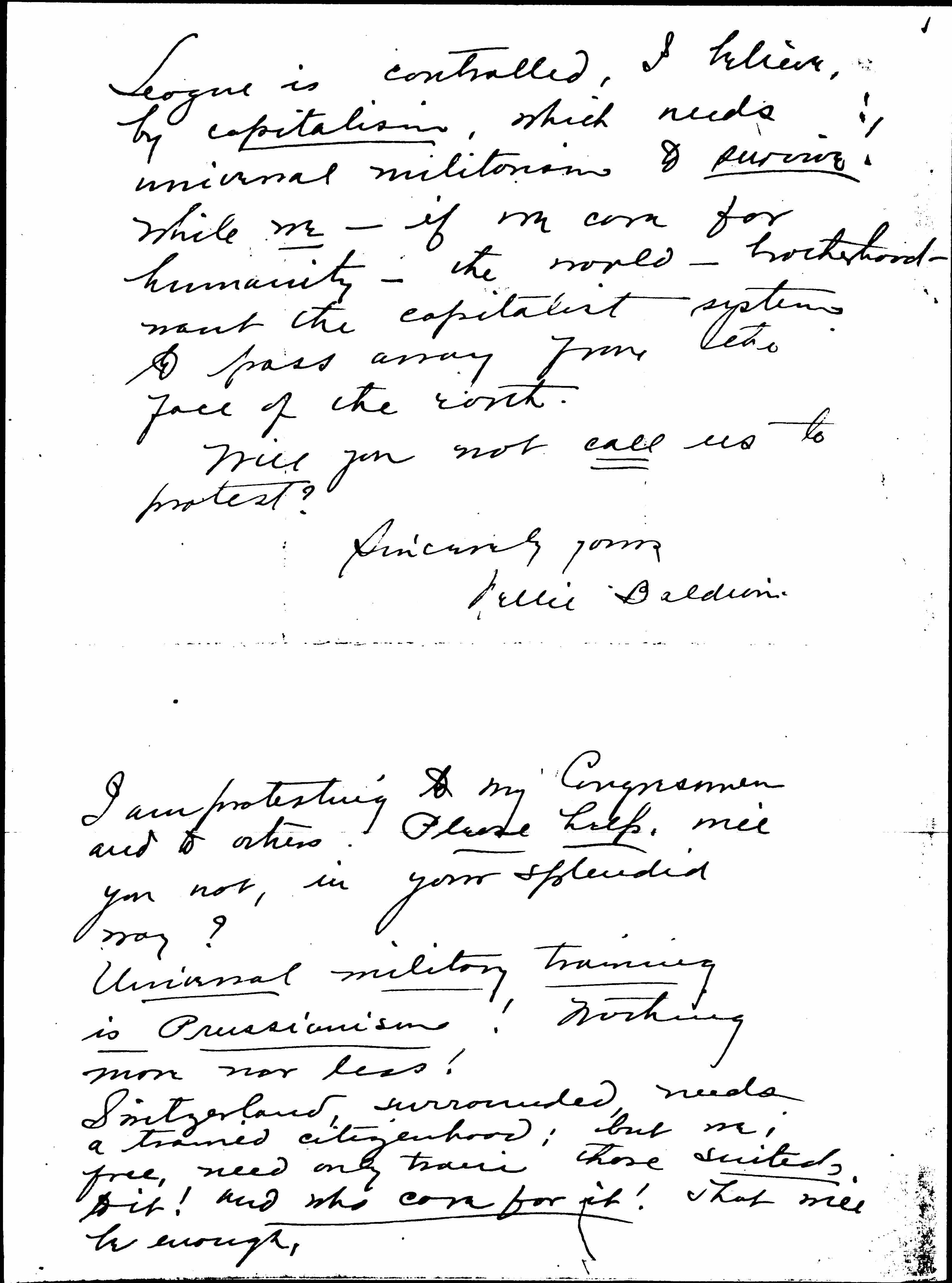 This is not pro-Germanism! It is pro-Americanism; this [page 2] League is controlled, I believe, by capitalism, which needs universal militarism to survive! While we -- if we care for humanity -- the world -- brotherhood -- want the capitalist system to pass away from the face of the earth.