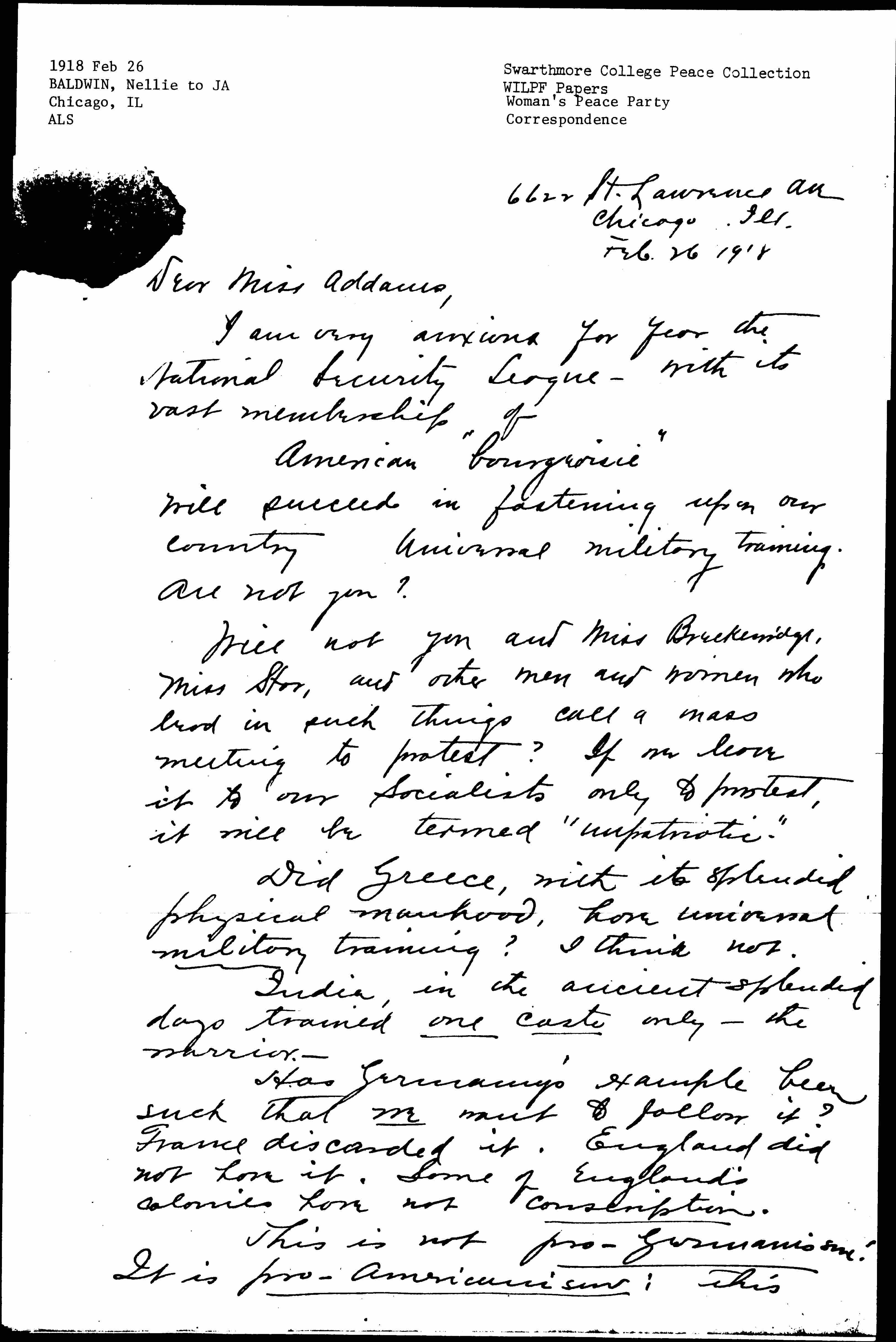 Will not you and Miss [Breckinridge], Miss [Starr], and other men and women who lead in such things call a mass meeting to protest? If we leave it to our Socialists only to protest, it will be termed "unpatriotic."