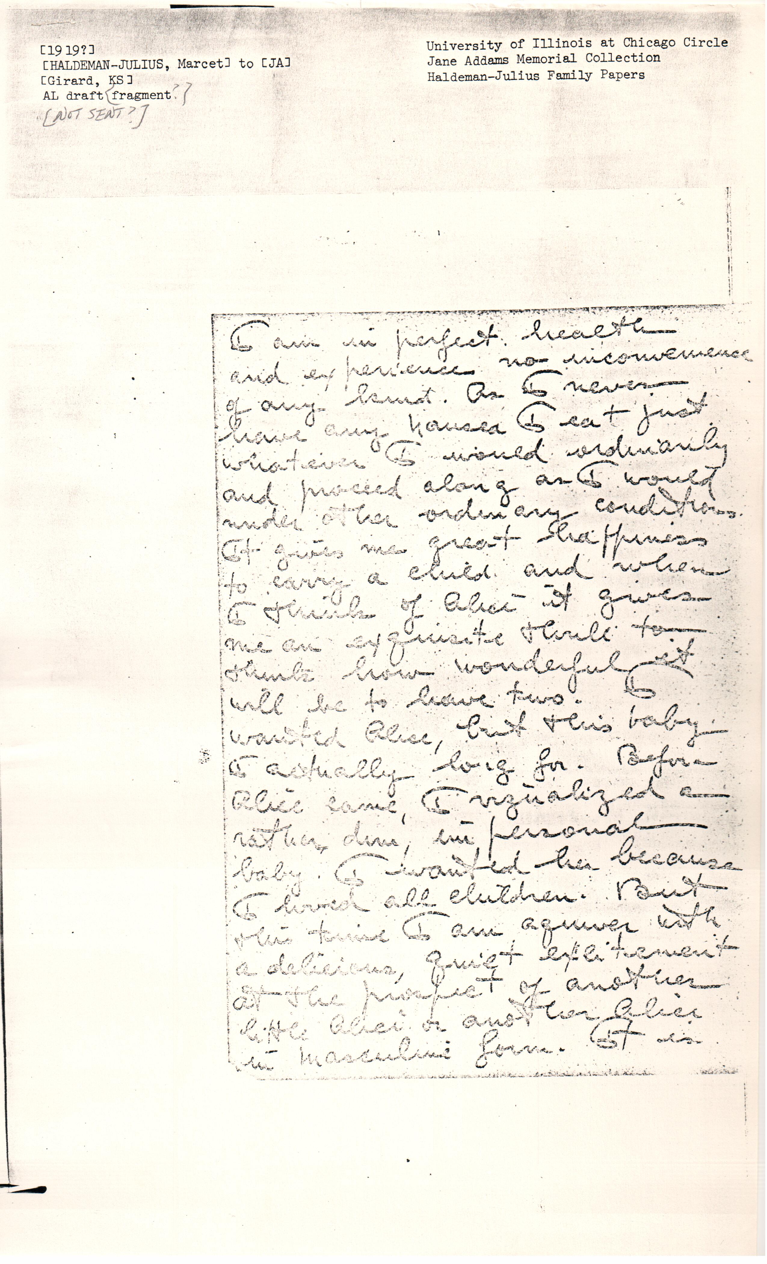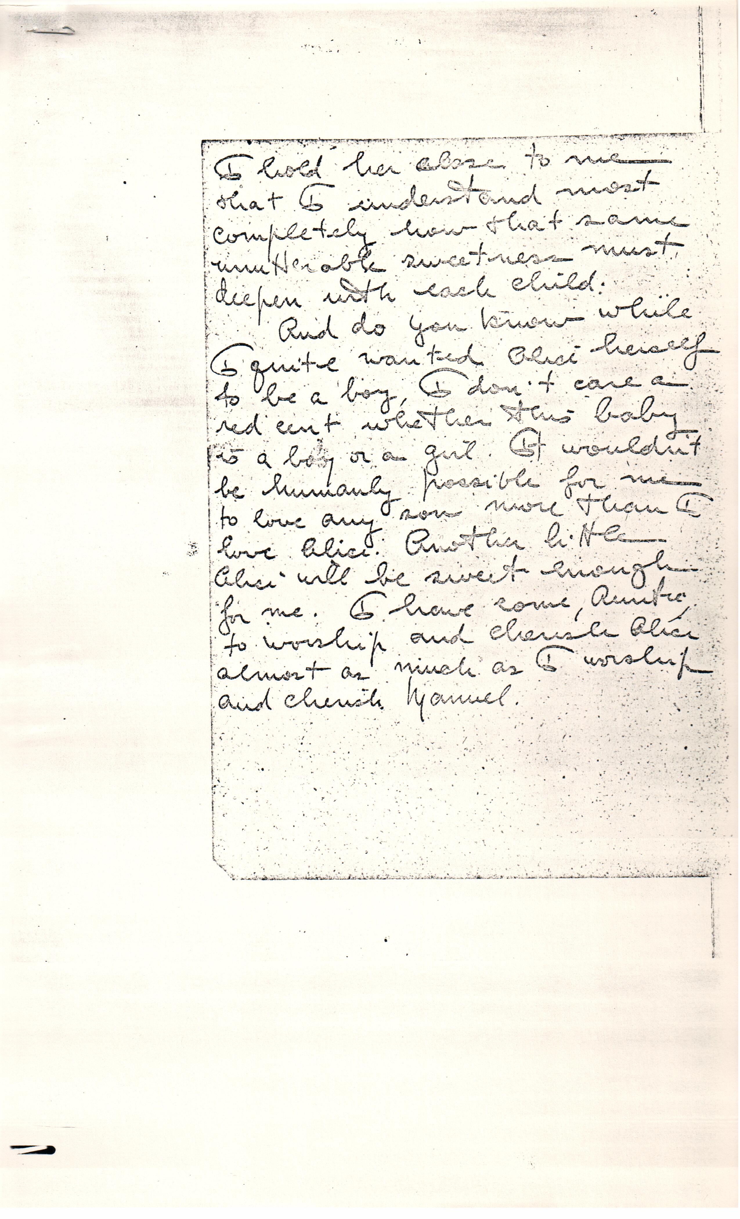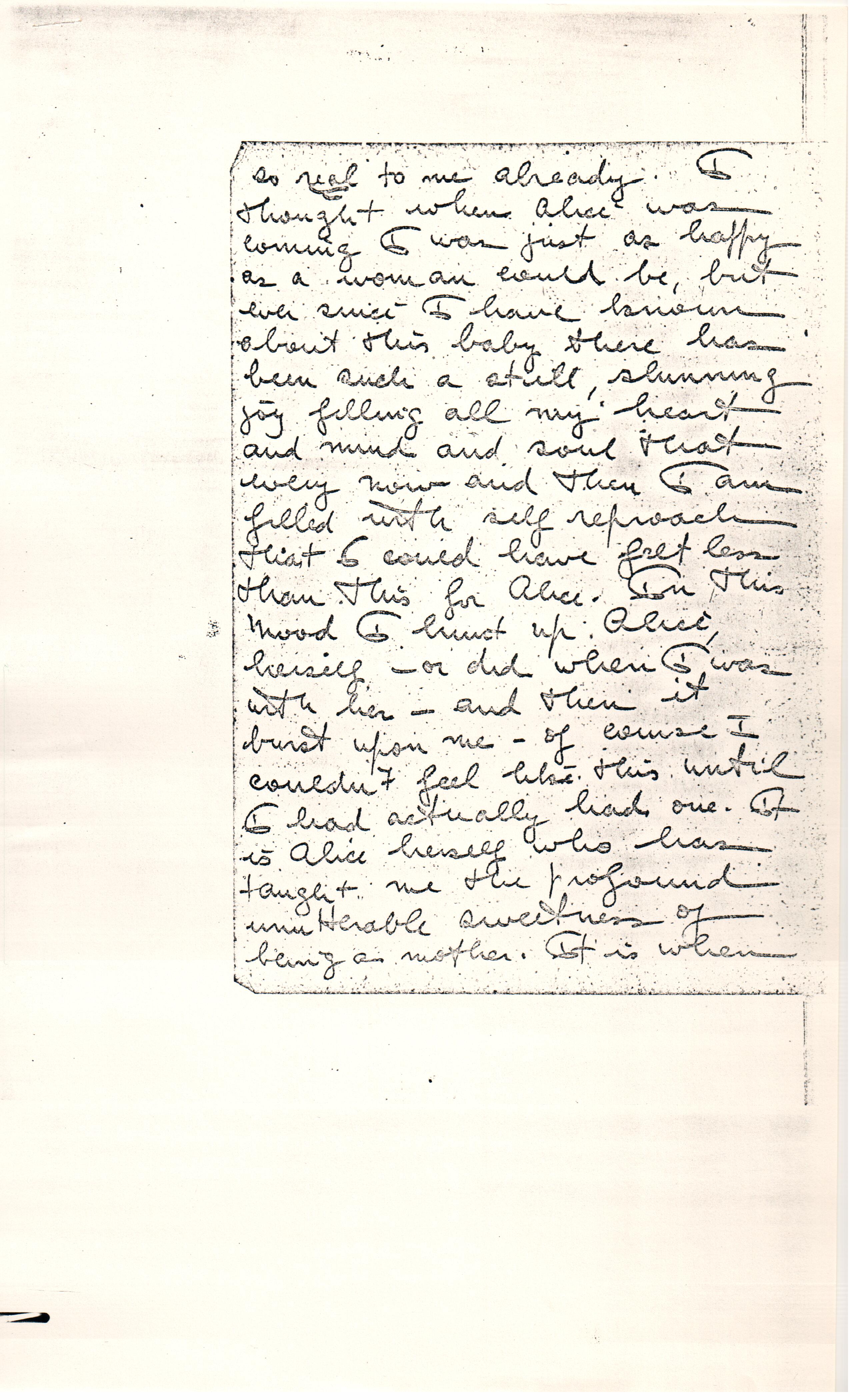 [first page(s) missing] I am in perfect health and experience no inconvenience of any kind. As I never have any nausea I eat just whatever I would ordinarily and proceed along as I would under other ordinary conditions. It gives me great happiness to carry a child and when I think of Alice it gives me an exquisite thrill to think how wonderful it will be to have two. I wanted Alice, but this baby I actually long for. Before Alice came, I visualized a rather dim, impersonal baby. I wanted her because I loved all children. But this time I am aquiver with a delicious, quiet excitement at the prospect of another little Alice or another Alice in masculine form. It is [page 2] so real to me already. I thought when Alice was coming I was just as happy as a woman could be, but ever since I have known about this baby there has been such a still, [shining] joy filling all my heart and mind and soul that every now and then I am filled with self reproach that I could have felt less than this for Alice. In this mood I [illegible] up Alice, herself -- or did when I was with her -- and then it burst upon me -- of course I couldn't feel like this until I had actually had one. It is Alice herself who has taught me the profound unutterable sweetness of being a mother. It is when [page 3] I hold her close to me that I understand most completely how that same unutterable sweetness must deepen with each child.