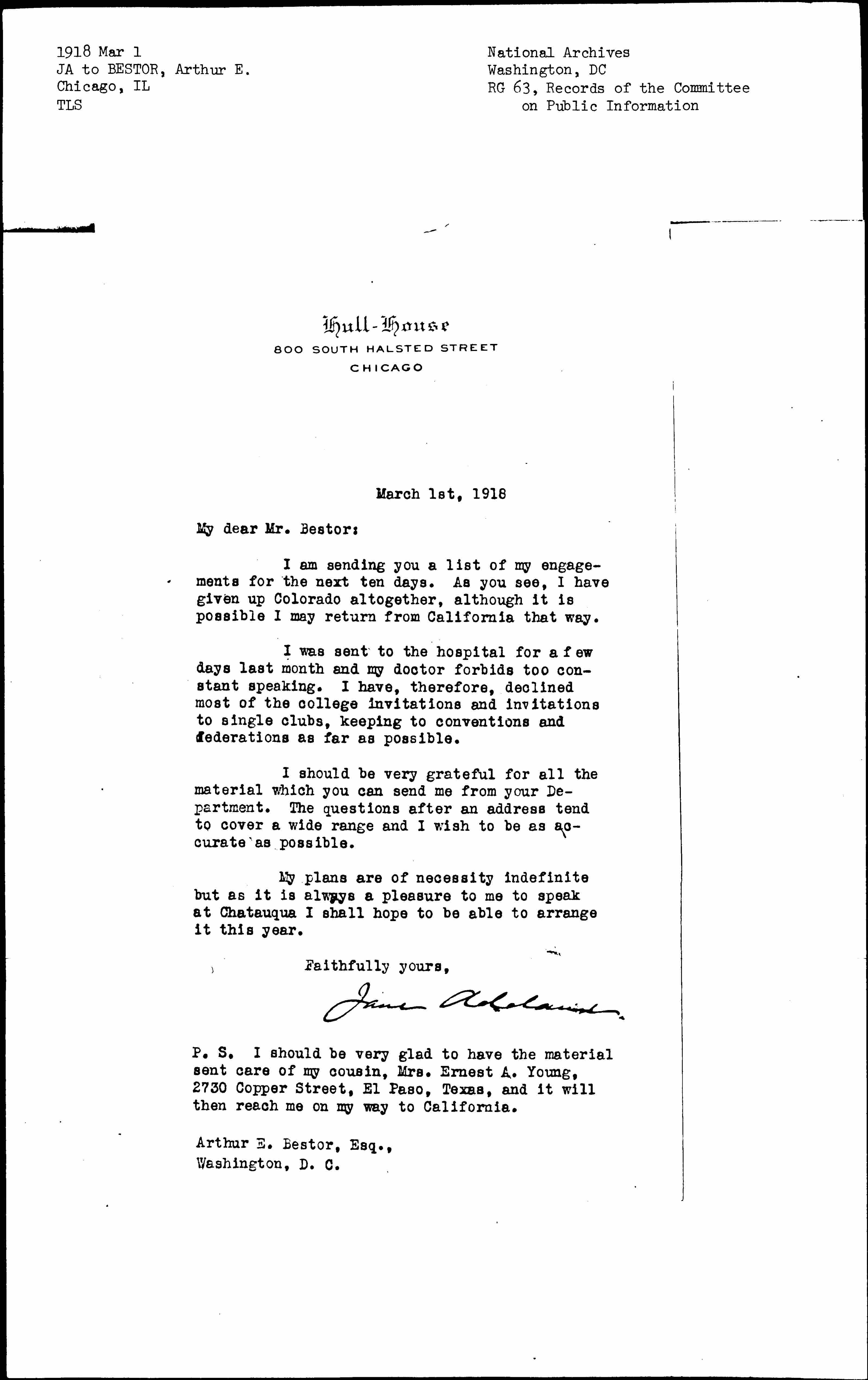 P.S. I should be very glad to have the material sent care of my cousin, Mrs. Ernest A. Young, 2730 Copper Street, El Paso, Texas, and it will then reach me on my way to California.