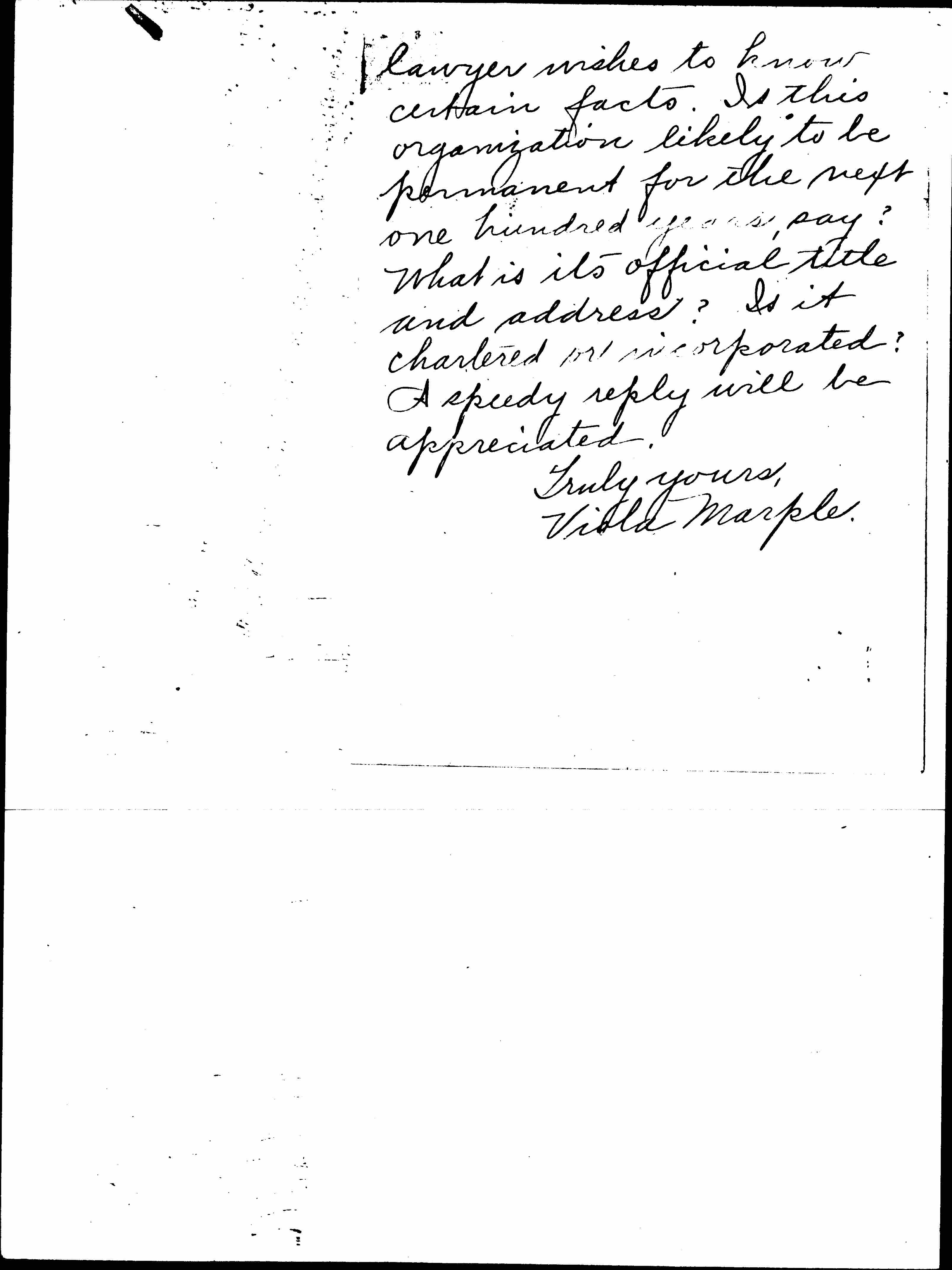 About the first week of December I wrote you in regard to some permanent [Peace] Organization. You gave me the Woman's Peace Party. I intend to join [illegible] soon, and help it all I can while I live. But I also intend to leave it some money in my will, which I am now having rewritten. My [page 2] lawyer wishes to know certain facts. Is this organization likely to be permanent for the next one hundred years, say? What is its official title and address? Is it chartered or incorporated? A speedy reply will be appreciated.
