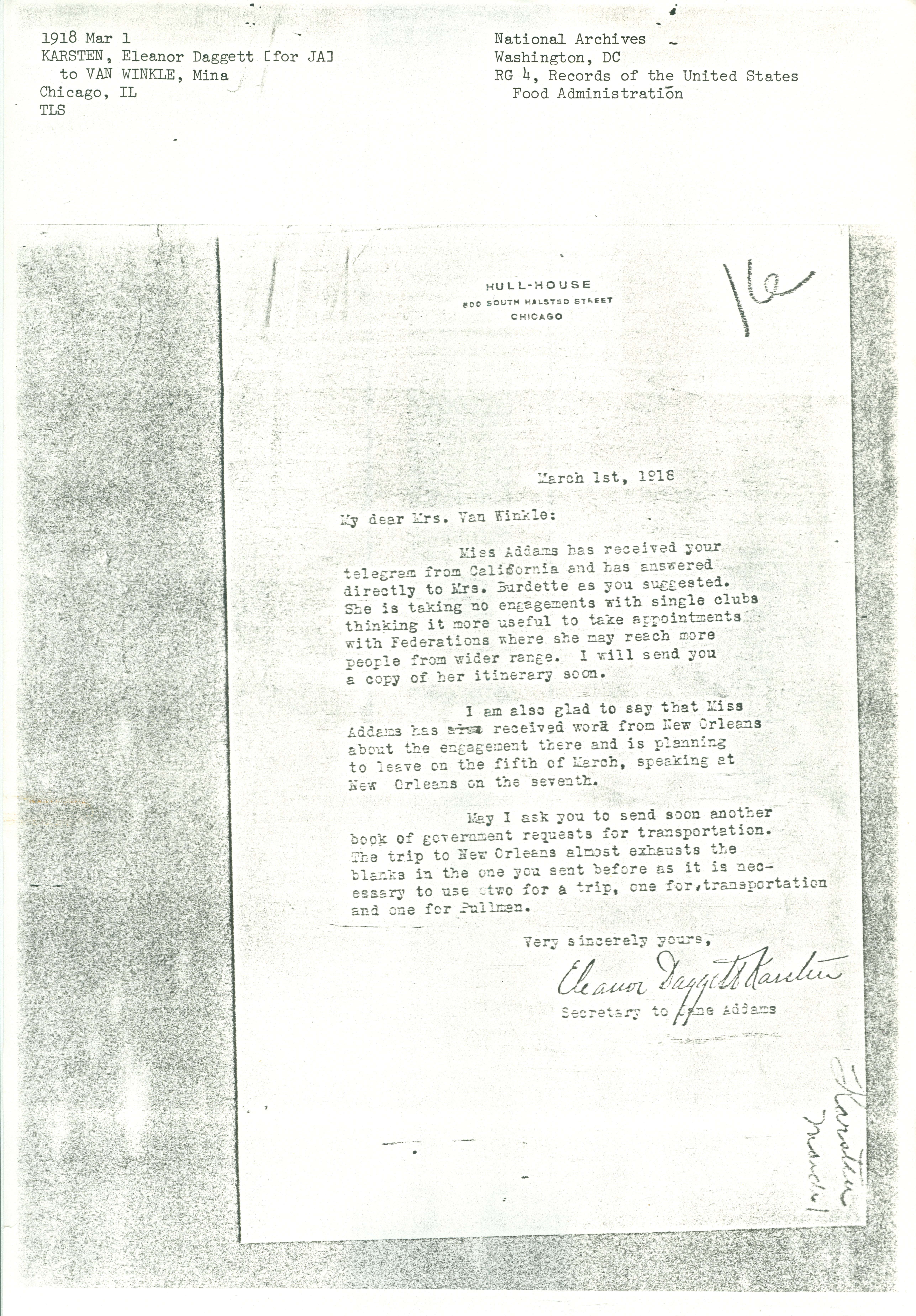 I am also glad to say that Miss Addams has also received word from New Orleans about the engagement there and is planning to leave on the fifth of March, speaking at New Orleans on the seventh.