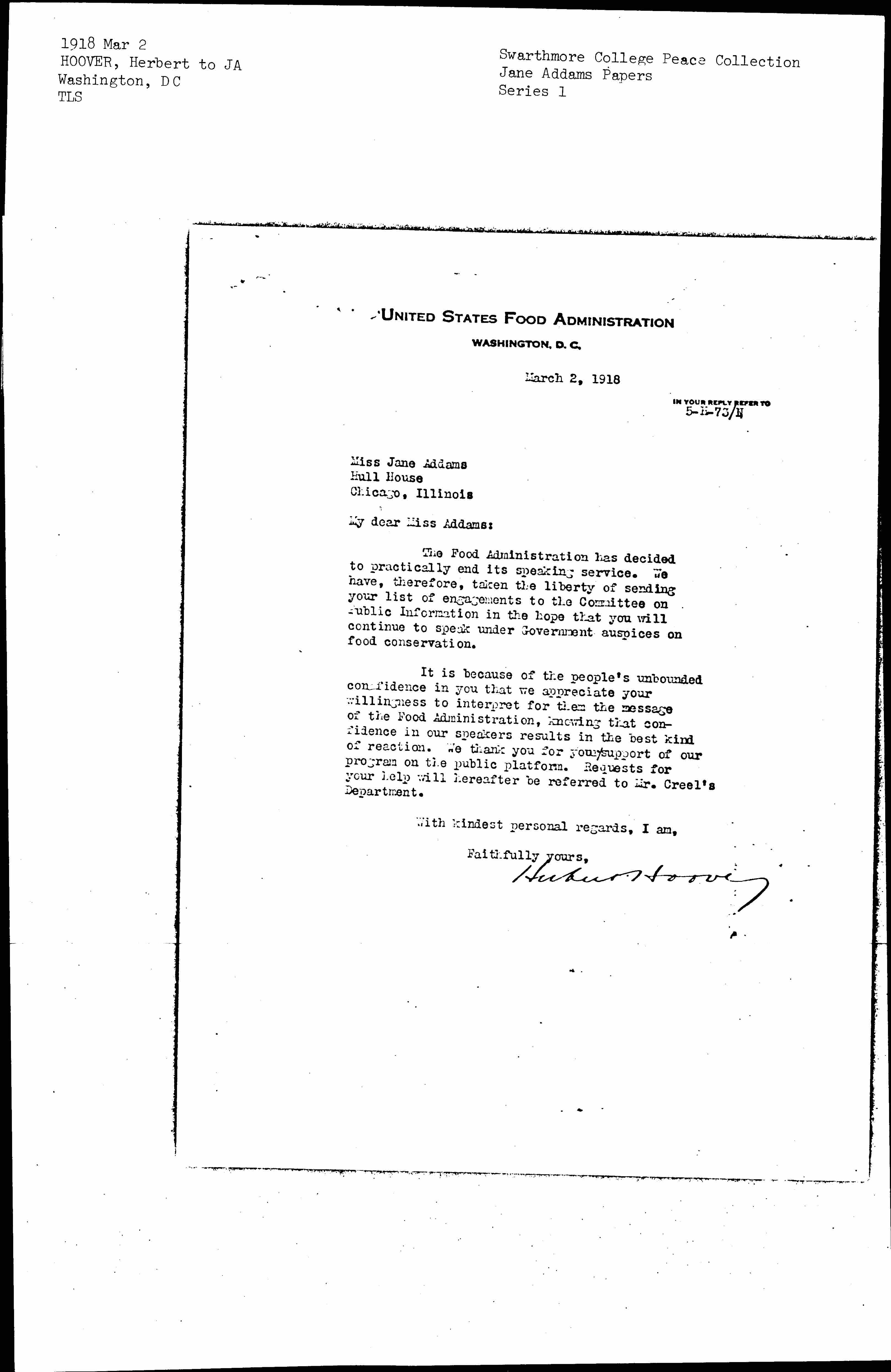 The Food Administration has decided to practically end its speaking service. We have, therefore, taken the liberty of sending your list of engagements to the Committee on Public Information in the hope that you will continue to speak under Government auspices on food conservation.