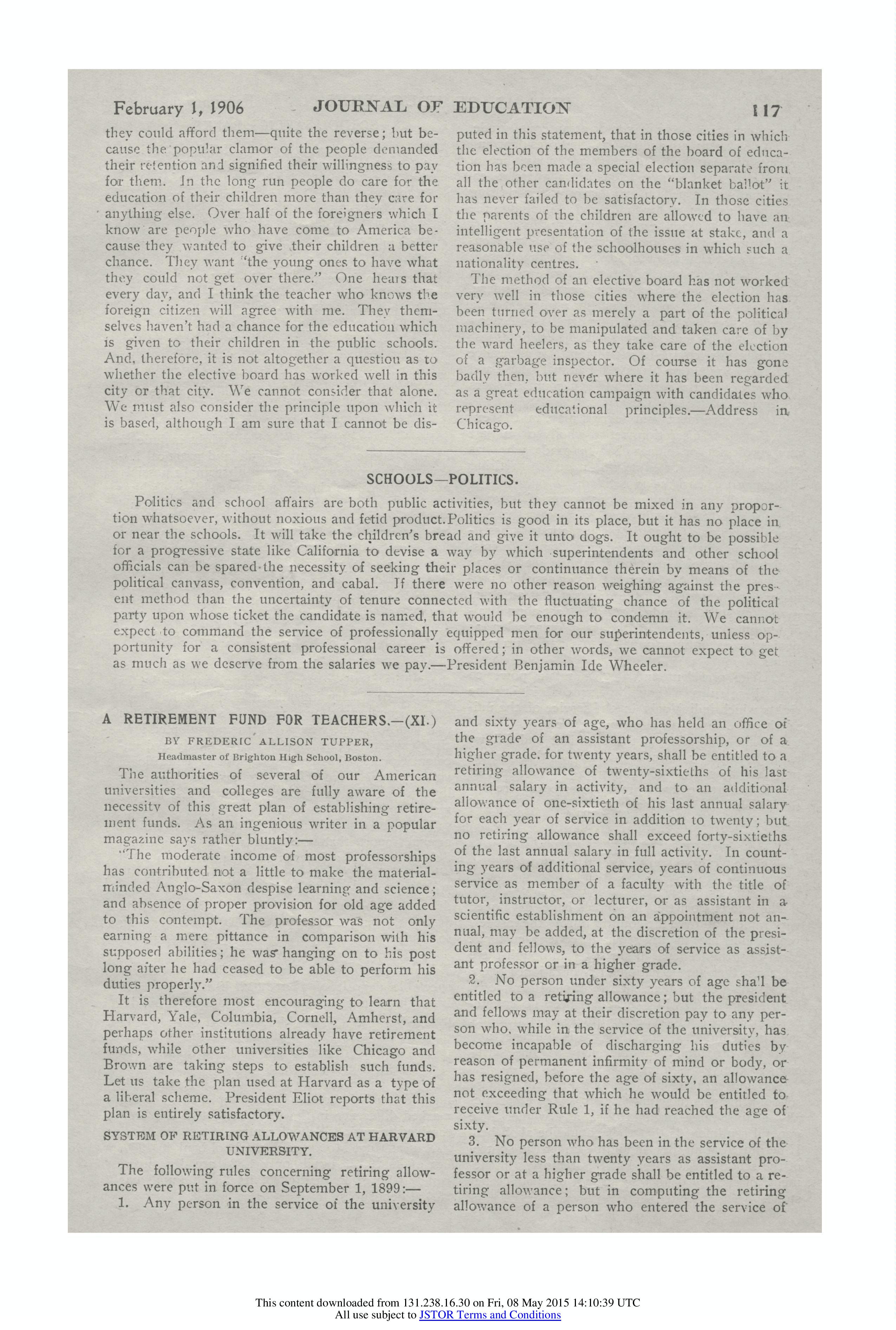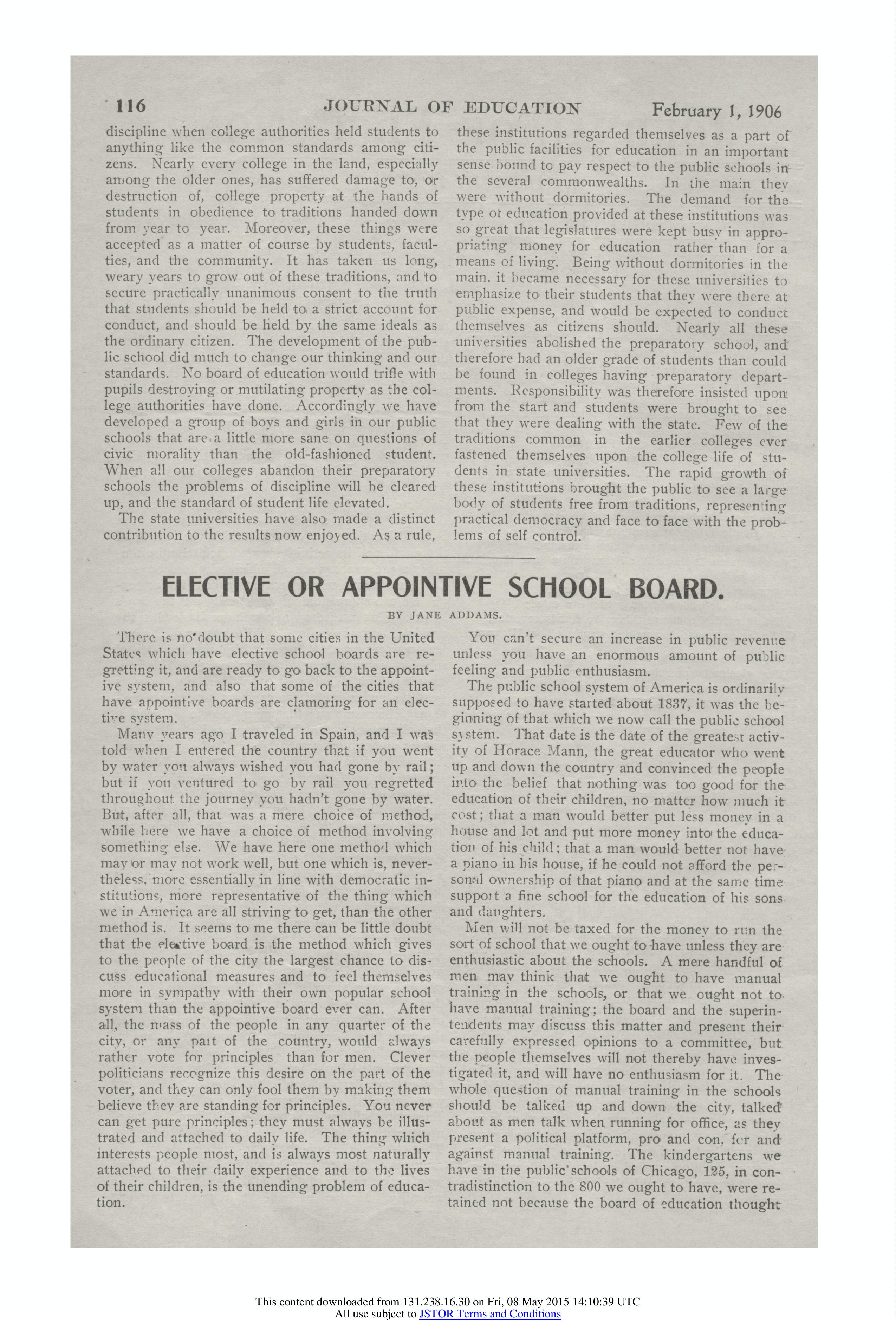 Men will not be taxed for the money to run the sort of school that we ought to have unless they are enthusiastic about the schools. A mere handful of men may think that we ought to have manual training in the schools, or that we ought not to have manual training; the board and the superintendents may discuss this matter and present their carefully expressed opinions to a committee, but the people themselves will not thereby have investigated it, and will have no enthusiasm for it. The whole question of manual training in the schools should be talked up and down the city, talked about as men talk when running for office, as they present a political platform, pro and con, for and against manual training. The kindergartens we have in the public schools of Chicago, 125, in contradistinction to the 800 we ought to have, were retained not because the board of education thought [page 2] they could afford them--quite the reverse; but because the popular clamor of the people demanded their retention and signified their willingness to pay for them. In the long run people do care for the education of their children more than they care for anything else. Over half of the foreigners which I know are people who have come to America because they wanted to give their children a better chance. They want "the young ones to have what they could not get over there." One hears that every day, and I think the teacher who knows the foreign citizen will agree with me. They themselves haven't had a chance for the education which is given to their children in the public schools. And, therefore, it is not altogether a question as to whether the elective board has worked well in this city or that city. We cannot consider that alone. We must also consider the principle upon which it is based, although I am sure that I cannot be disputed in this statement, that in those cities in which the election of the members of the board of education has been made a special election separate from all the other candidates on the "blanket ballot" it has never failed to be satisfactory. In those cities the parents of the children are allowed to have an intelligent presentation of the issue at stake, and a reasonable use of the school houses in which such a nationality [centers].