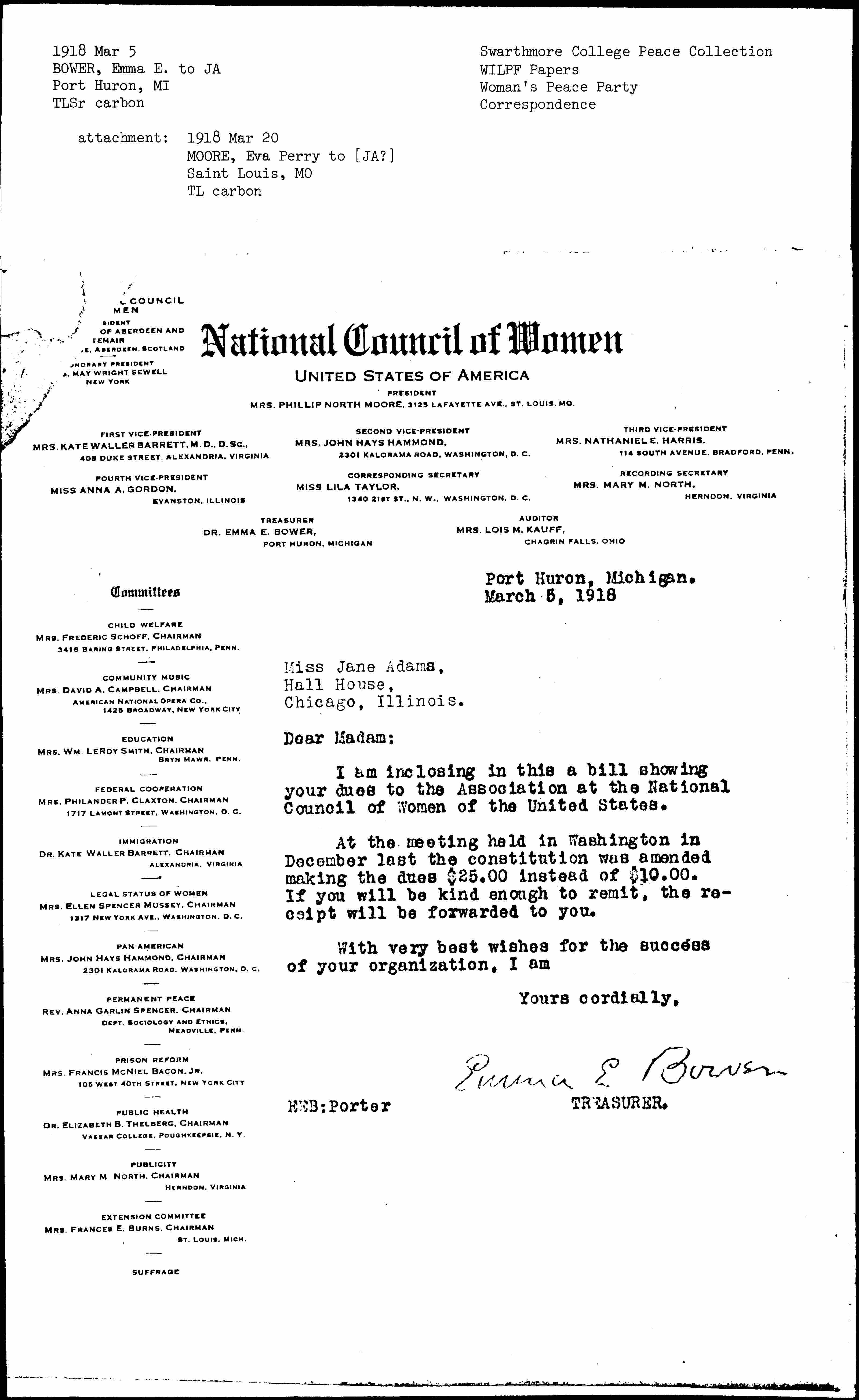 I am [enclosing] in this a bill showing your dues to the Association at the National Council of Women of the United States.