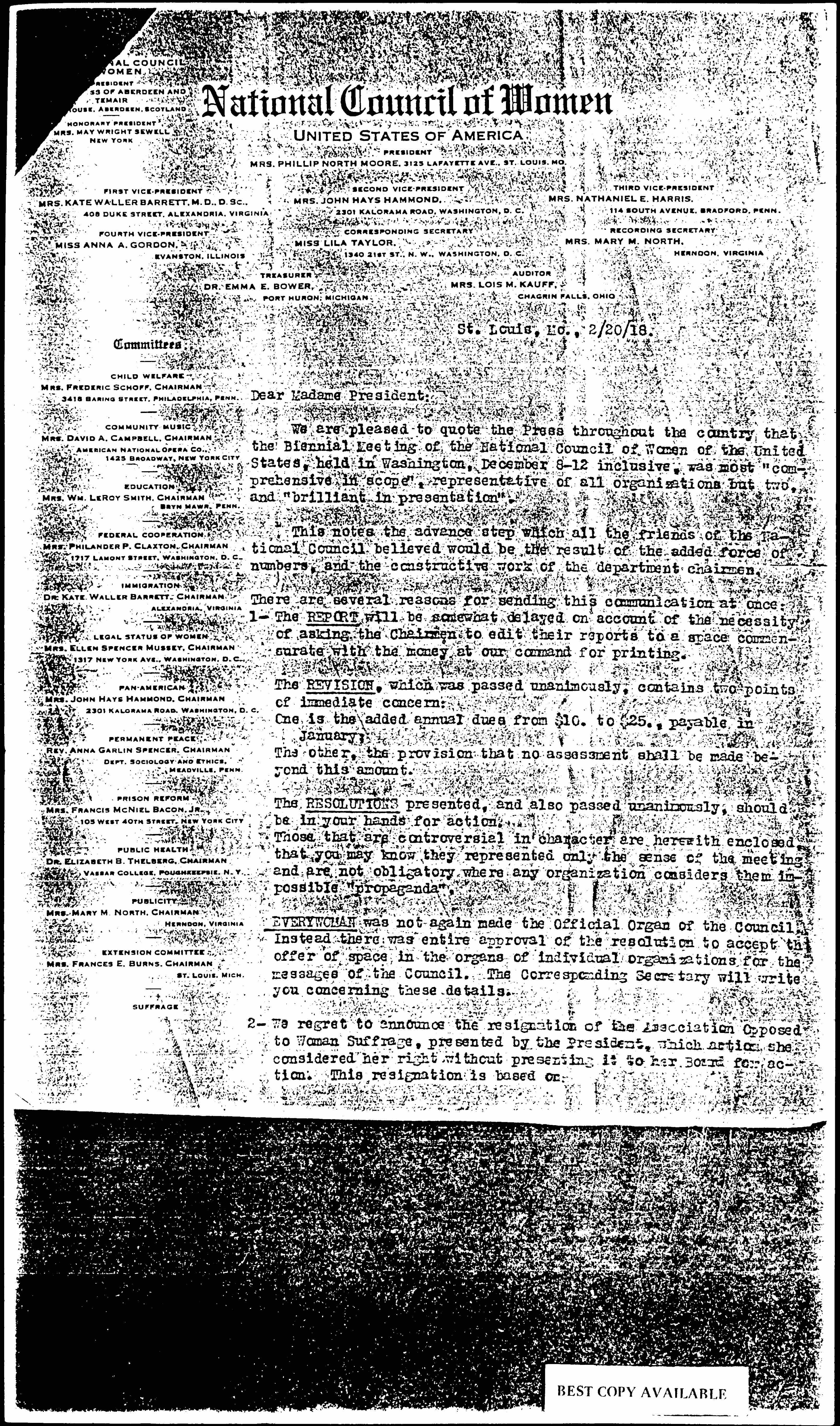 We ask each president to consider and send to the President of the National Council of Women the names and addresses of Presidents of Local Councils -- or State organizations, whose national bodies are not in membership in the National Council, that we may consider their desire for membership and eligibility.