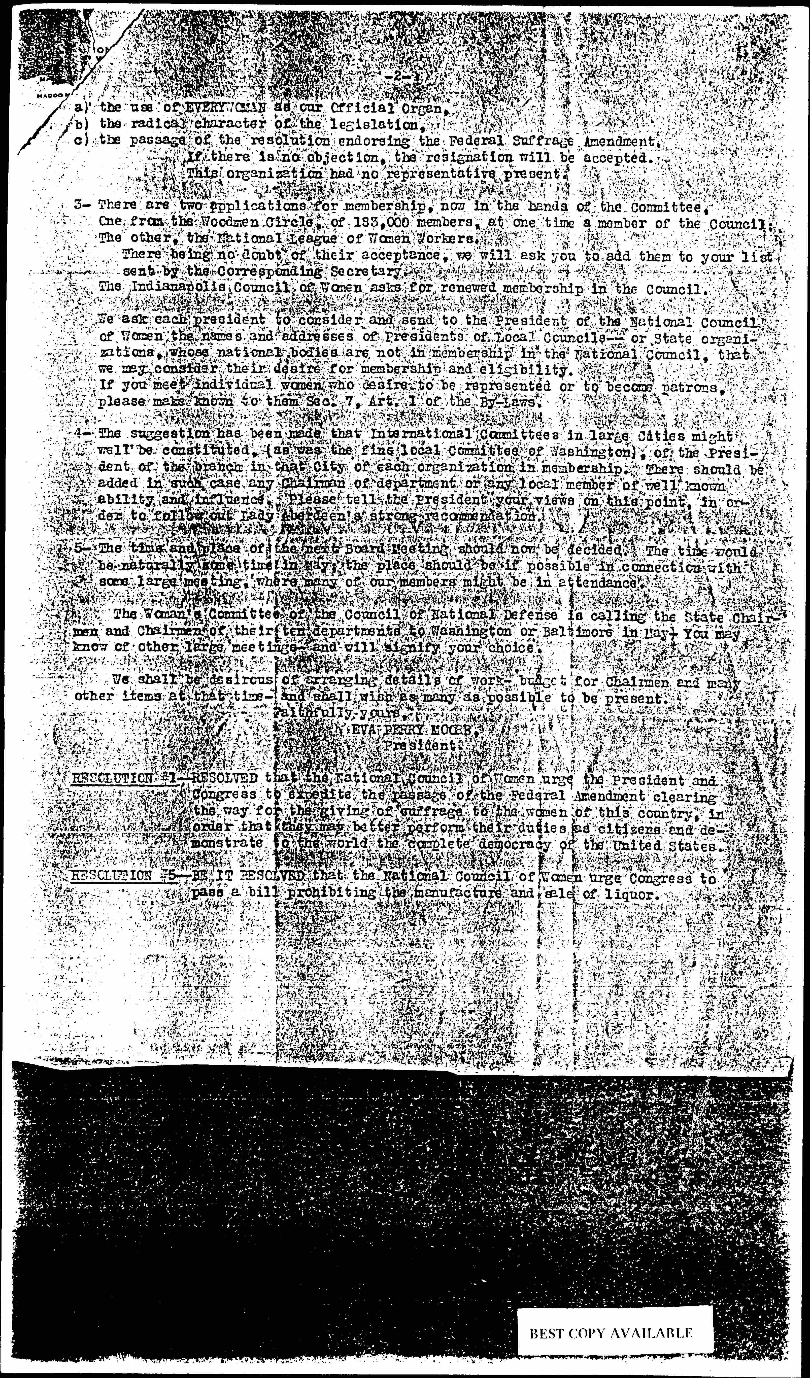 RESOLUTION #1 -- RESOLVED that the National Council of Women urge the President and Congress to expedite the passage of the Federal Amendment clearing the way for the giving of suffrage to the women of this country, in order that they may better perform their duties as citizens and demonstrate to the world the complete democracy of the United States.