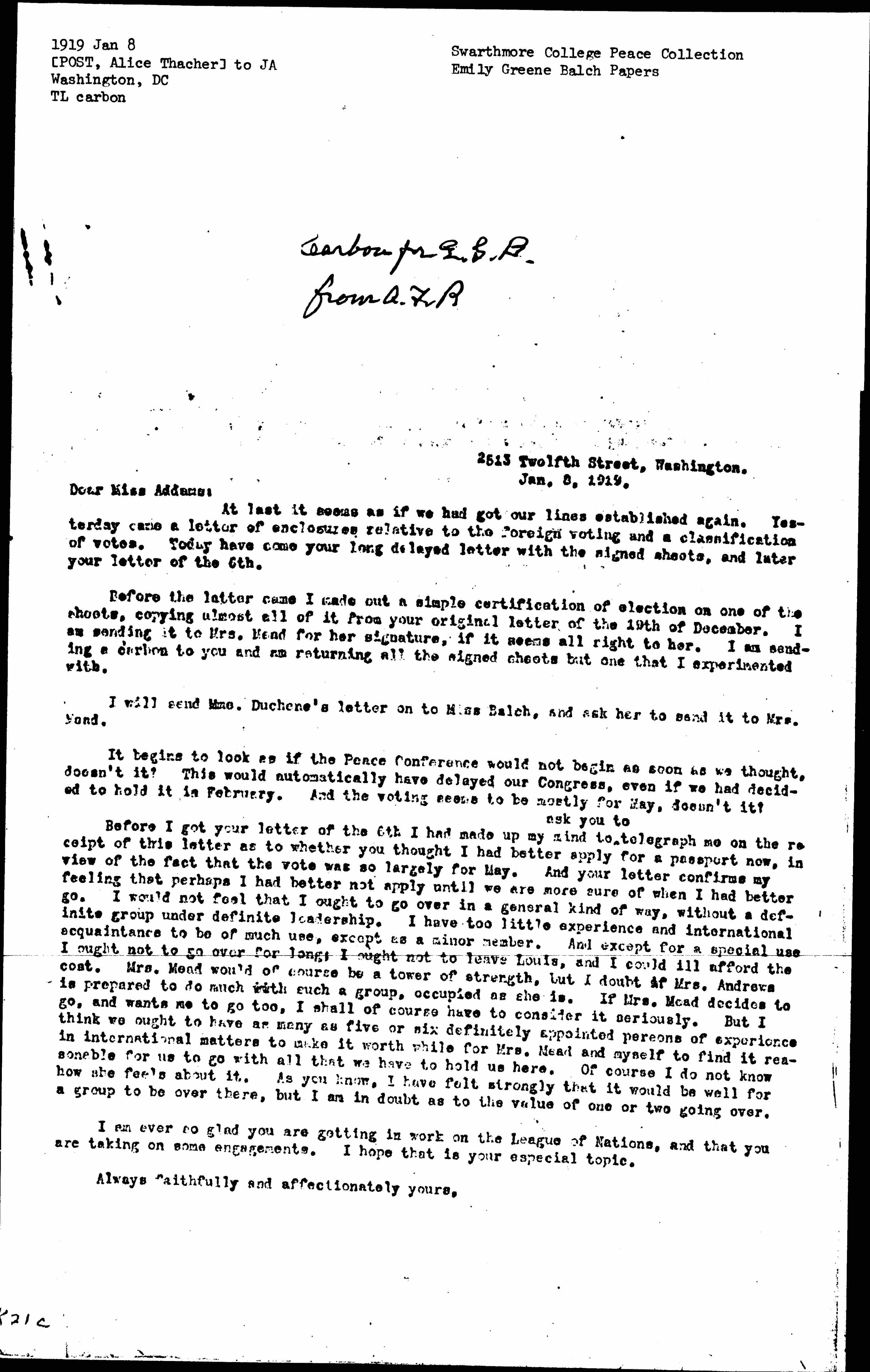 Before I got your letter of the 6th I had made up my mind to ↑ask you to↓ telegraph me on the receipt of this letter as to whether you thought I had better apply for a passport now, in view of the fact that the vote was so largely for May. And your letter confirms my feeling that perhaps I had better not apply until we are more sure of when I had better go. I would not feel that I ought to go over in a general kind of way, without a definite group under definite leadership. I have too little experience and international acquaintance to be of much use, except as a minor member. And except for a special use I ought not to go over for long; I ought not to leave Louis, and I could ill afford the cost. Mrs. Mead would of course be a tower of strength, but I doubt if Mrs. Andrews is prepared to do much with such a group, occupied as she is. If Mrs. Mead decides to go, and wants me to go too, I shall of course have to consider it seriously. But I think we ought to have as many as five or six definitely appointed persons of experience in international matters to make it worth while for Mrs. Mead and myself to find it reasonable for us to go with all that we have to hold us here. Of course I do not know how she feels about it. As you know, I have felt strongly that it would be well for a group to be over there, but I am in doubt as to the value of one or two going over.