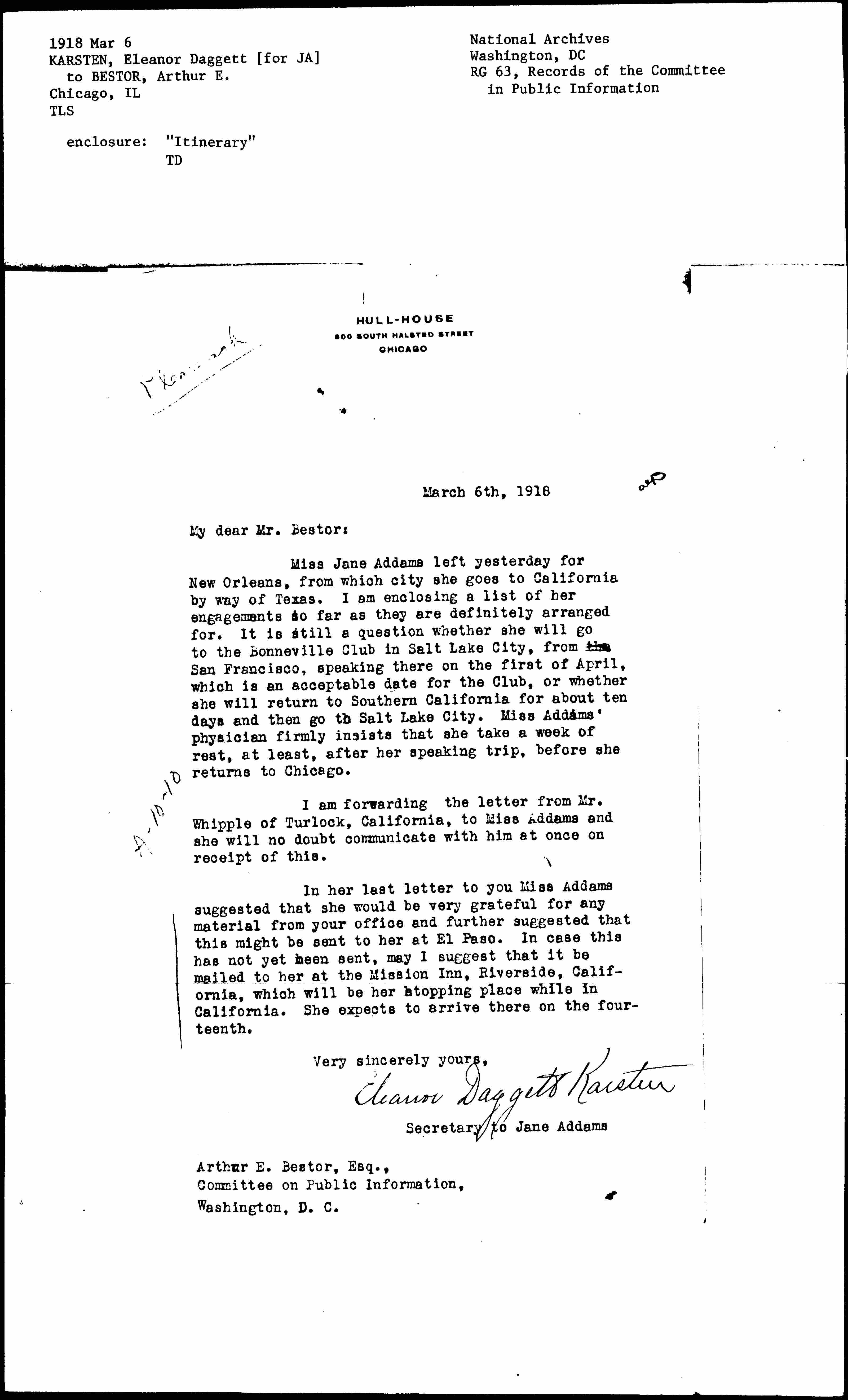 In her last letter to you Miss Addams suggested that she would be very grateful for any material from your office and further suggested that this might be sent to her at El Paso. In case this has not yet been sent, may I suggest that it be mailed to her at the Mission Inn, Riverside, California, which will be her stopping place while in California. She expects to arrive there on the fourteenth.