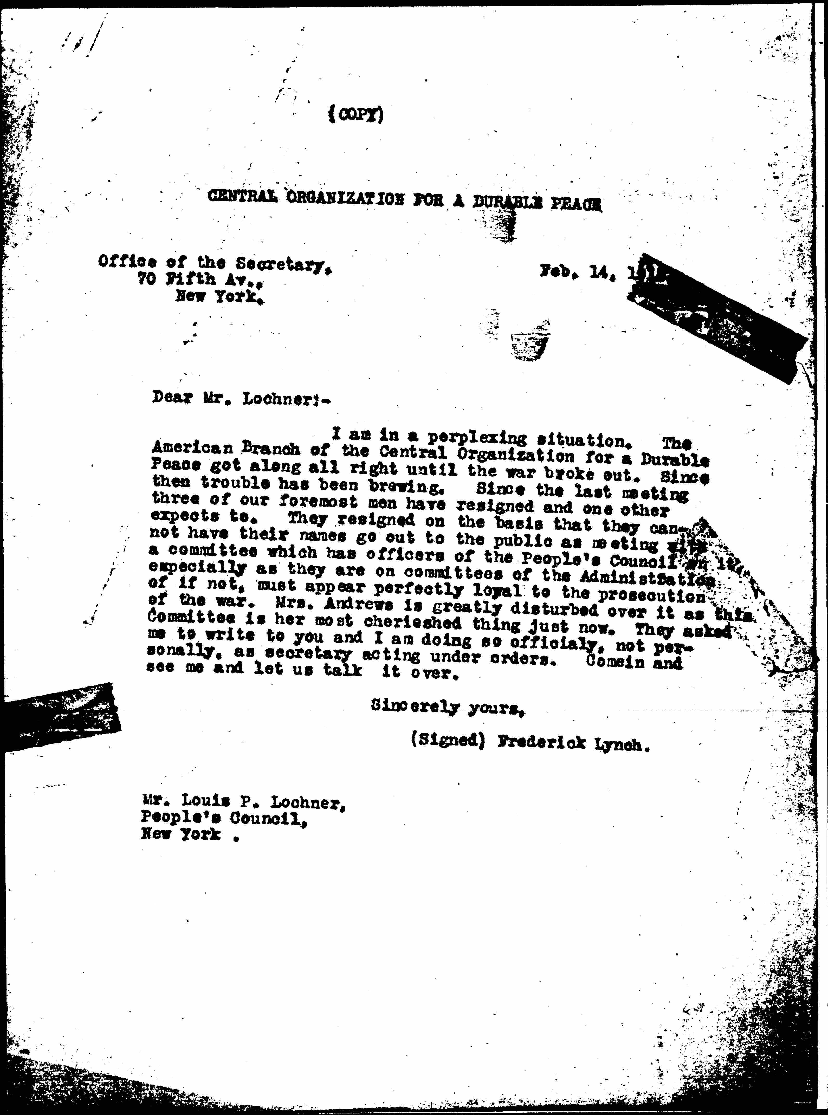 I am in a perplexing situation. The American Branch of the Central Organization for a Durable Peace got along all right until the war broke out. Since then trouble has been brewing. Since the last meeting three of our foremost men have resigned and one other expects to. They resigned on the basis that they cannot have their names go out to the public as meeting with a committee which has officers of the People's Council on it, especially as they are on committees of the Administration [or] if not, must appear perfectly loyal to the prosecution of the war. Mrs. Andrews is greatly disturbed over it as this Committee is her most cherished thing just now. They asked me to write to you and I am doing so officially, not personally, as secretary acting under orders. Come in and see me and let us talk it over.