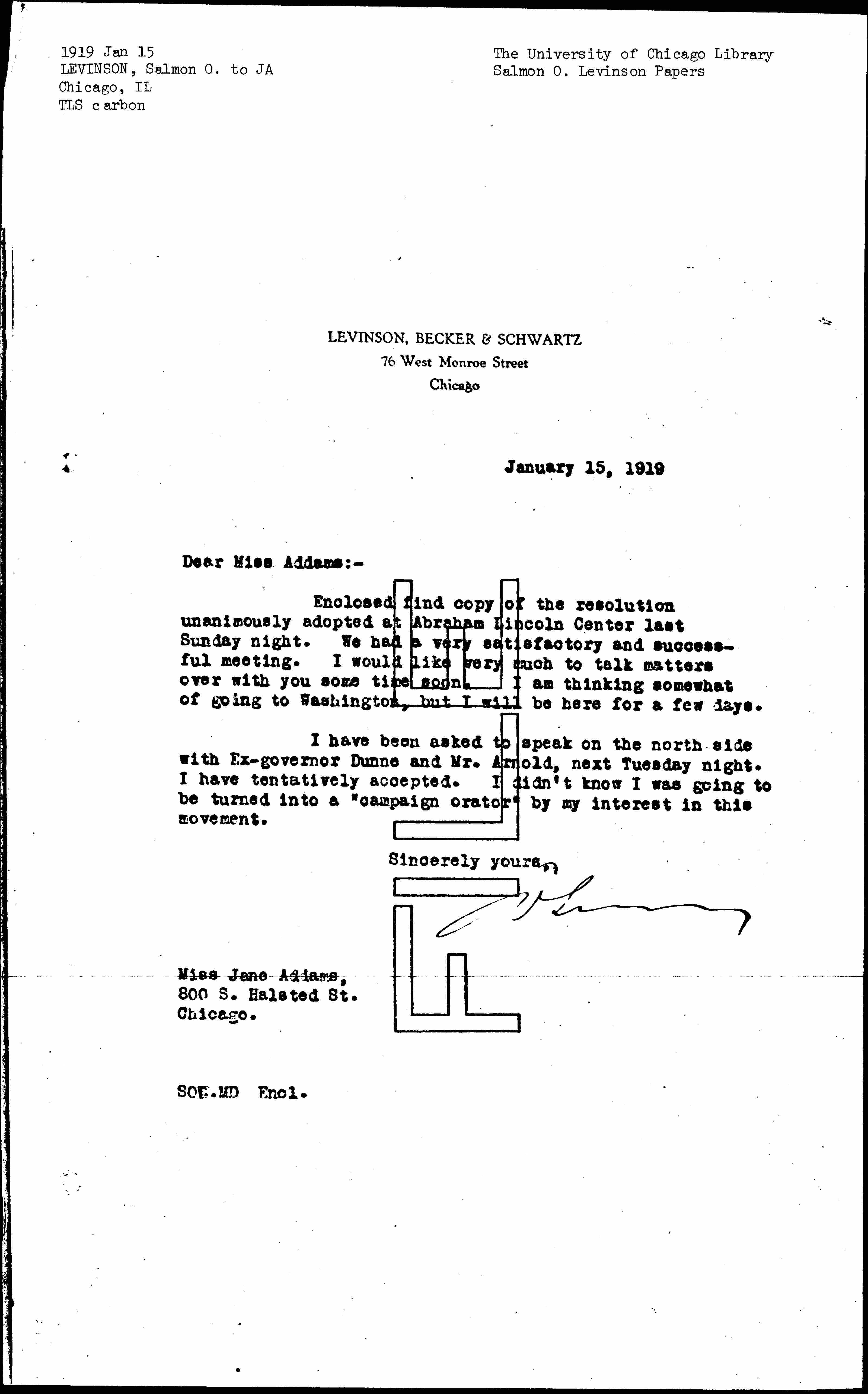 Enclosed find copy of the resolution unanimously adopted at Abraham Lincoln [Centre] last Sunday night. We had a very satisfactory and successful meeting. I would like very much to talk matters over with you some time soon. I am thinking somewhat of going to Washington, but I will be here for a few days.
