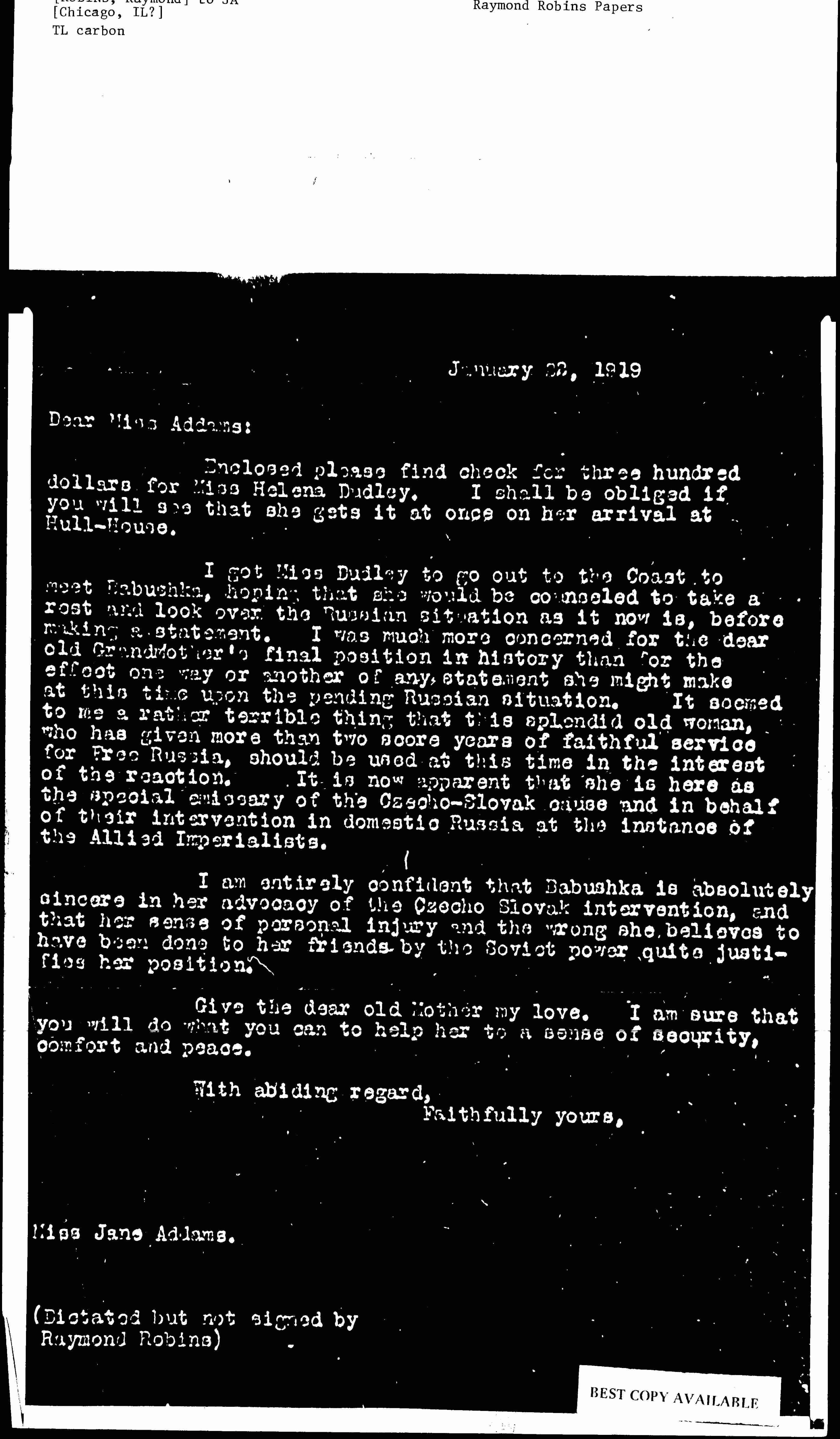 Enclosed please find check for three hundred dollars for Miss Helena Dudley. I shall be obliged if you will see that she gets it at once on her arrival at Hull-House.