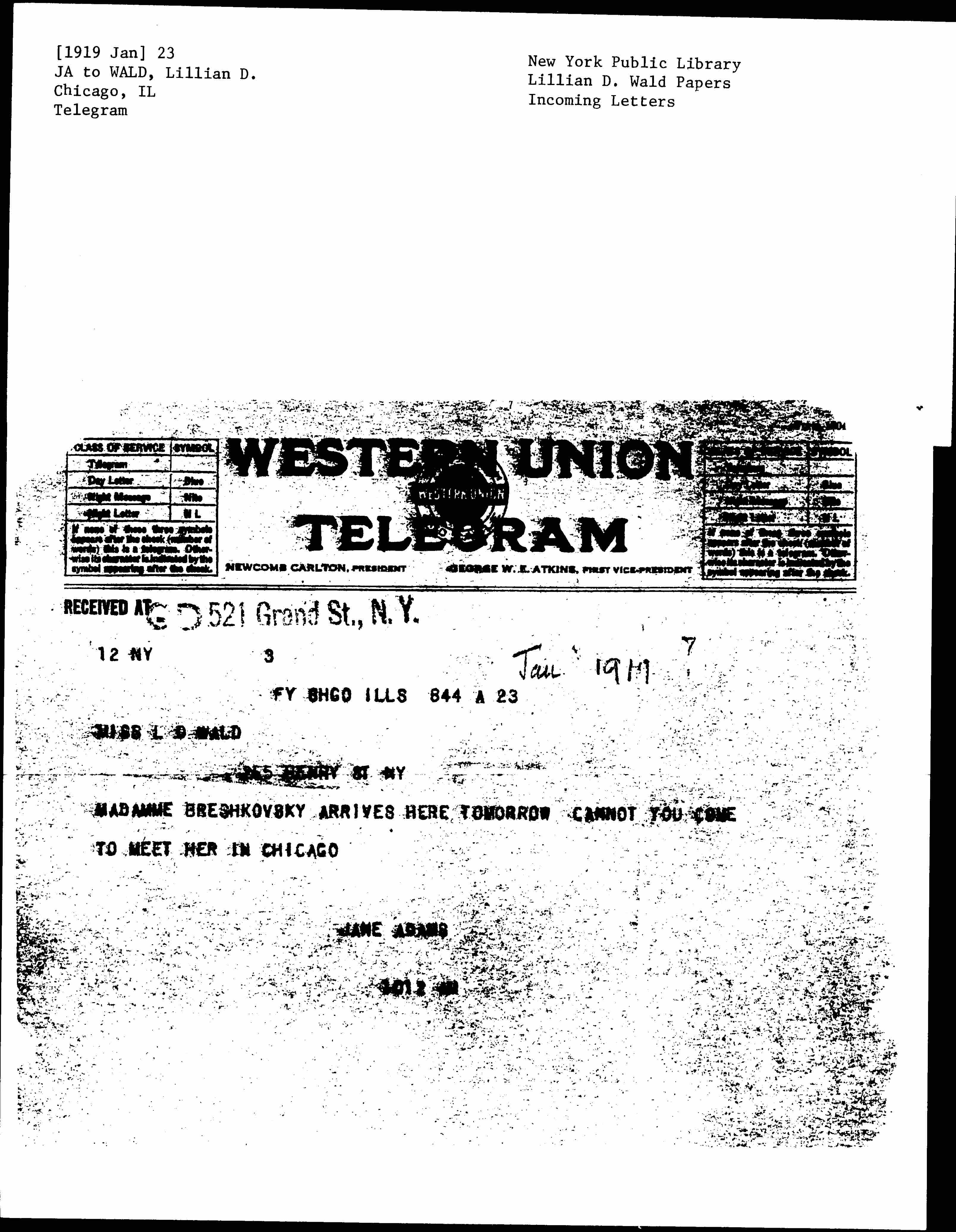 [MADAME] BRESHKOVSKY ARRIVES HERE TOMORROW CANNOT YOU COME TO MEET HER IN CHICAGO