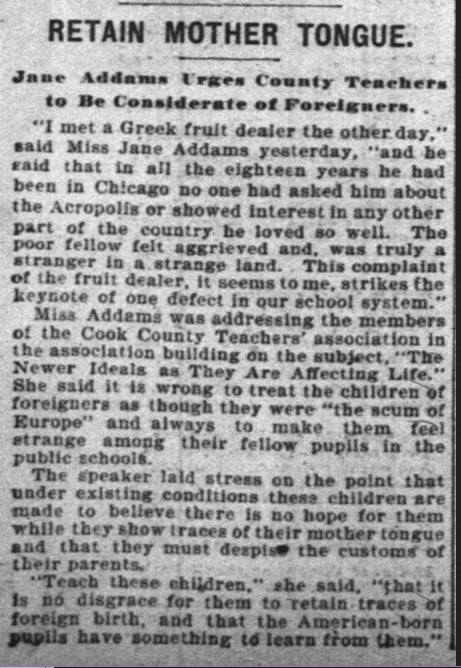 Miss Addams was addressing the members of the Cook County Teachers' Association in the association building on the subject, "The Newer Ideals as They Are Affecting Life." She said it is wrong to treat the children of foreigners as though they were "the scum of Europe" and always to make them feel strange among their fellow pupils in the public schools.