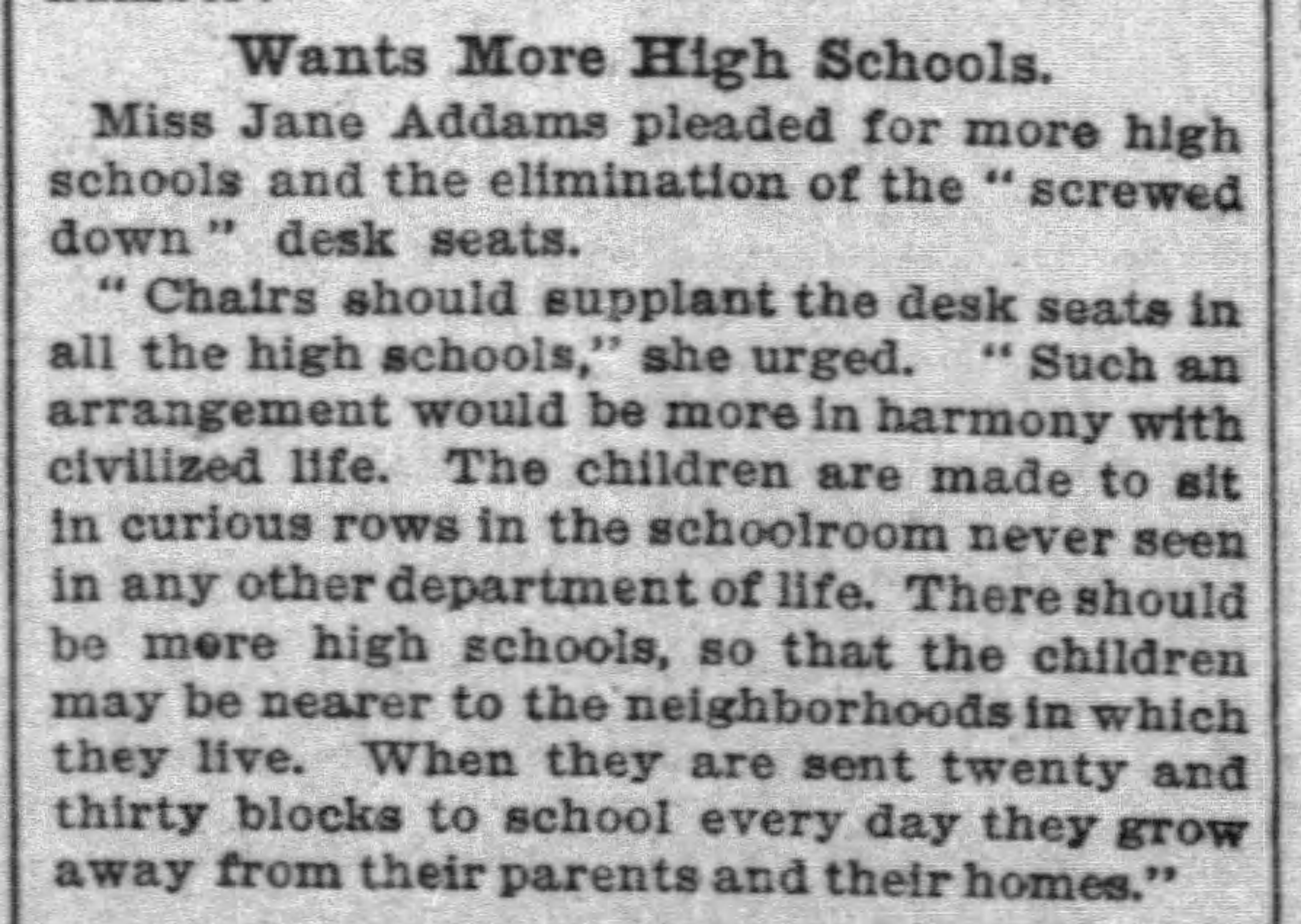 Miss Jane Addams pleaded for more high schools and the elimination of the "screwed down" desk seats.