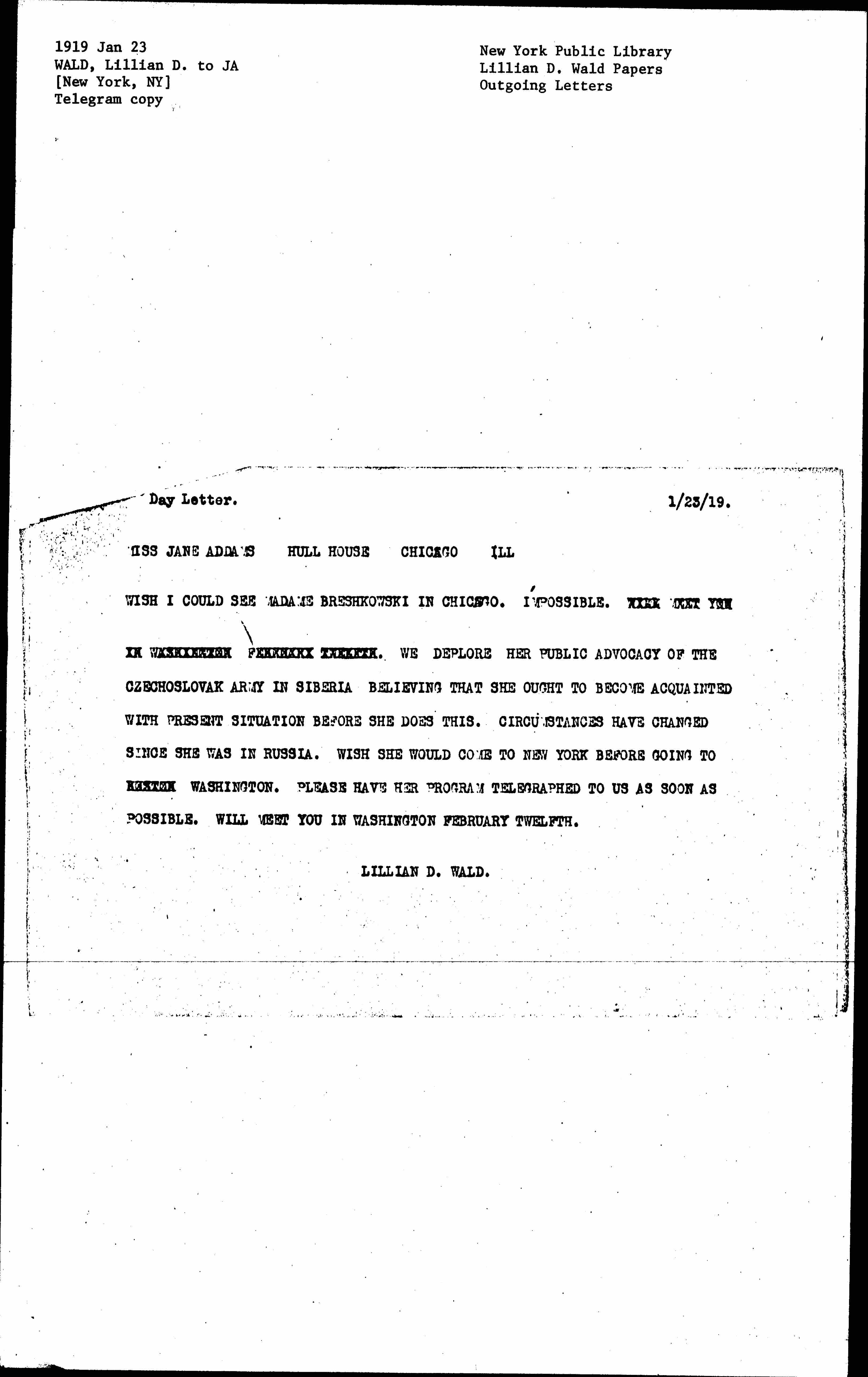 WISH I COULD SEE MADAME [BRESHKOVSKY] IN CHICAGO. IMPOSSIBLE. WILL MEET YOU IN WASHINGTON FEBRUARY TWELFTH WE DEPLORE HER PUBLIC ADVOCACY OF THE CZECHOSLOVAK ARMY IN SIBERIA BELIEVING THAT SHE OUGHT TO BECOME ACQUAINTED WITH PRESENT SITUATION BEFORE SHE DOES THIS. CIRCUMSTANCES HAVE CHANGED SINCE SHE WAS IN RUSSIA. WISH SHE WOULD COME TO NEW YORK BEFORE GOING TO [illegible] WASHINGTON. PLEASE HAVE HER PROGRAM TELEGRAPHED TO US AS SOON AS POSSIBLE. WILL MEET YOU IN WASHINGTON FEBRUARY TWELFTH.