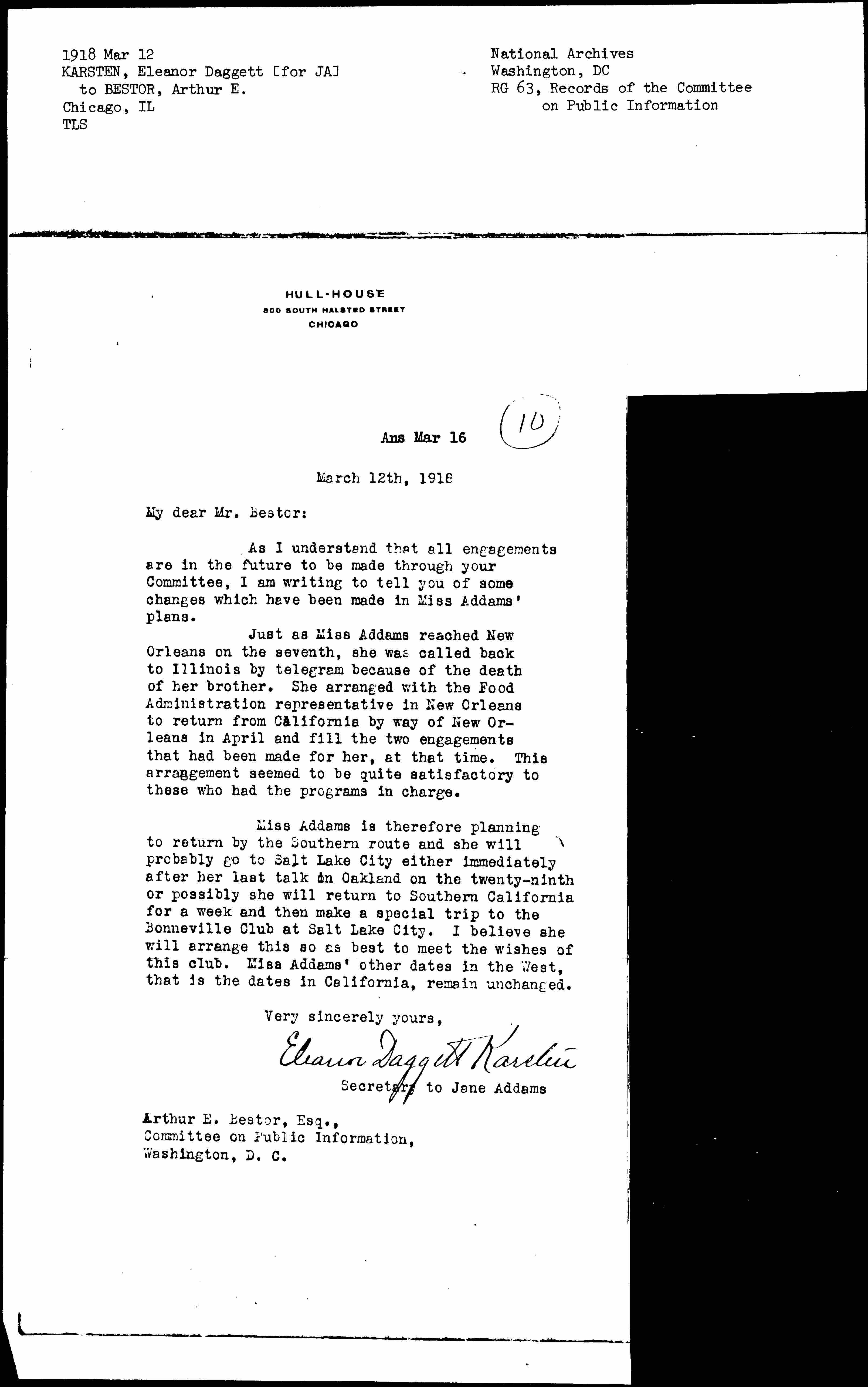Miss Addams is therefore planning to return by the Southern route and she will probably go to Salt Lake City either immediately after her last talk in Oakland on the twenty-ninth or possibly she will return to Southern California for a week and then make a special trip to the Bonneville Club at Salt Lake City. I believe she will arrange this so as best to meet the wishes of this club. Miss Addams' other dates in the West, that is the dates in California, remain unchanged.