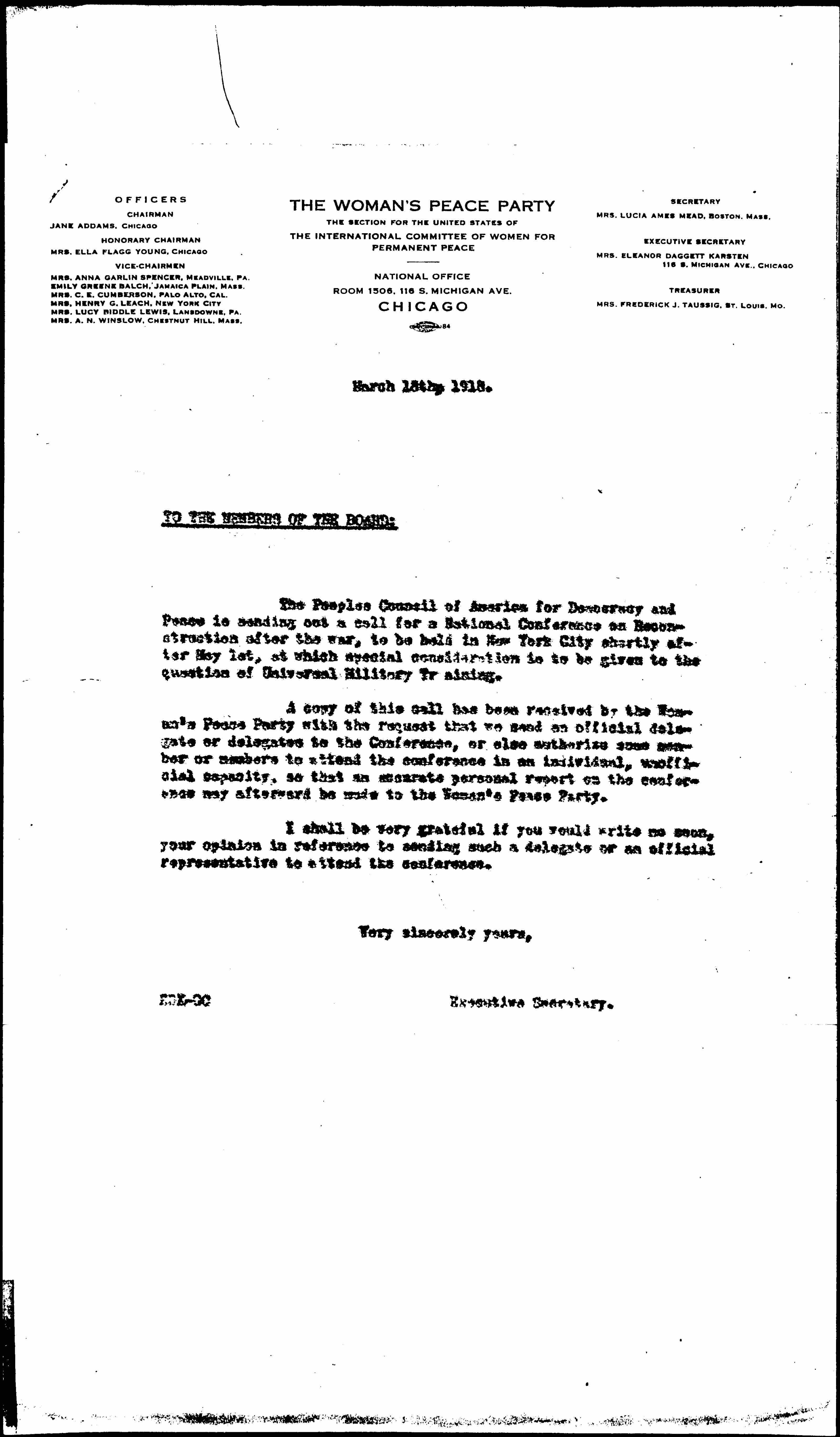 A copy of this call has been received by the Woman's Peace Party with the request that we send an official delegate or delegates to the Conference, or else authorize some member or members to attend the conference in an individual, unofficial capacity, so that an accurate personal report on the conference may afterward be made to the Woman's Peace Party.
