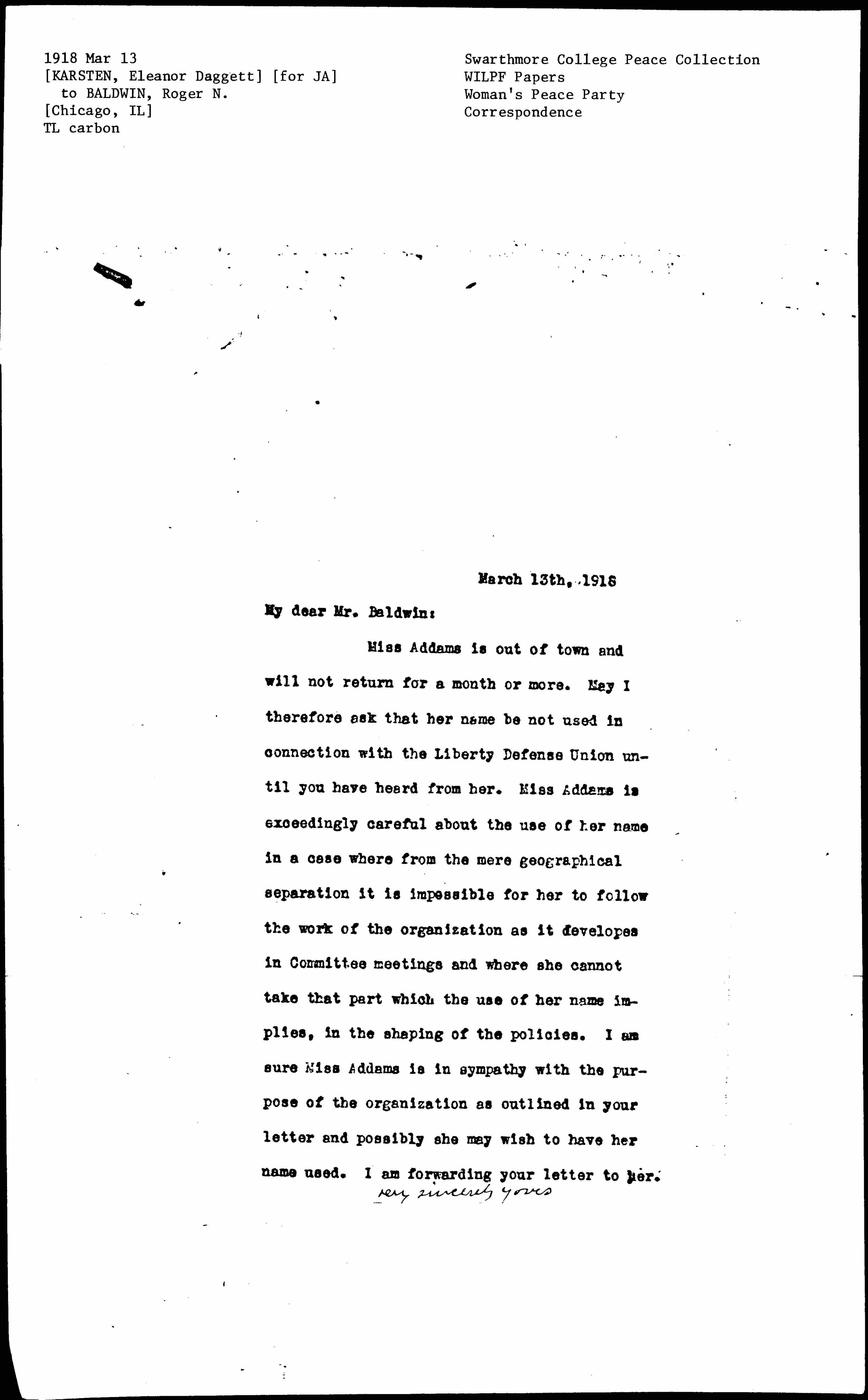 Miss Addams is out of town and will not return for a month or more. May I therefore ask that her name be not used in connection with the Liberty Defense Union until you have heard from her. Miss Addams is exceedingly careful about the use of her name in a case where from the mere geographical separation it is impossible for her to follow the work of the organization as it [develops] in Committee meetings and where she cannot take that part which the use of her name implies, in the shaping of the policies. I am sure Miss Addams is in sympathy with the purpose of the organization as outlined in your letter and possibly she may wish to have her name used. I am forwarding your letter to her.