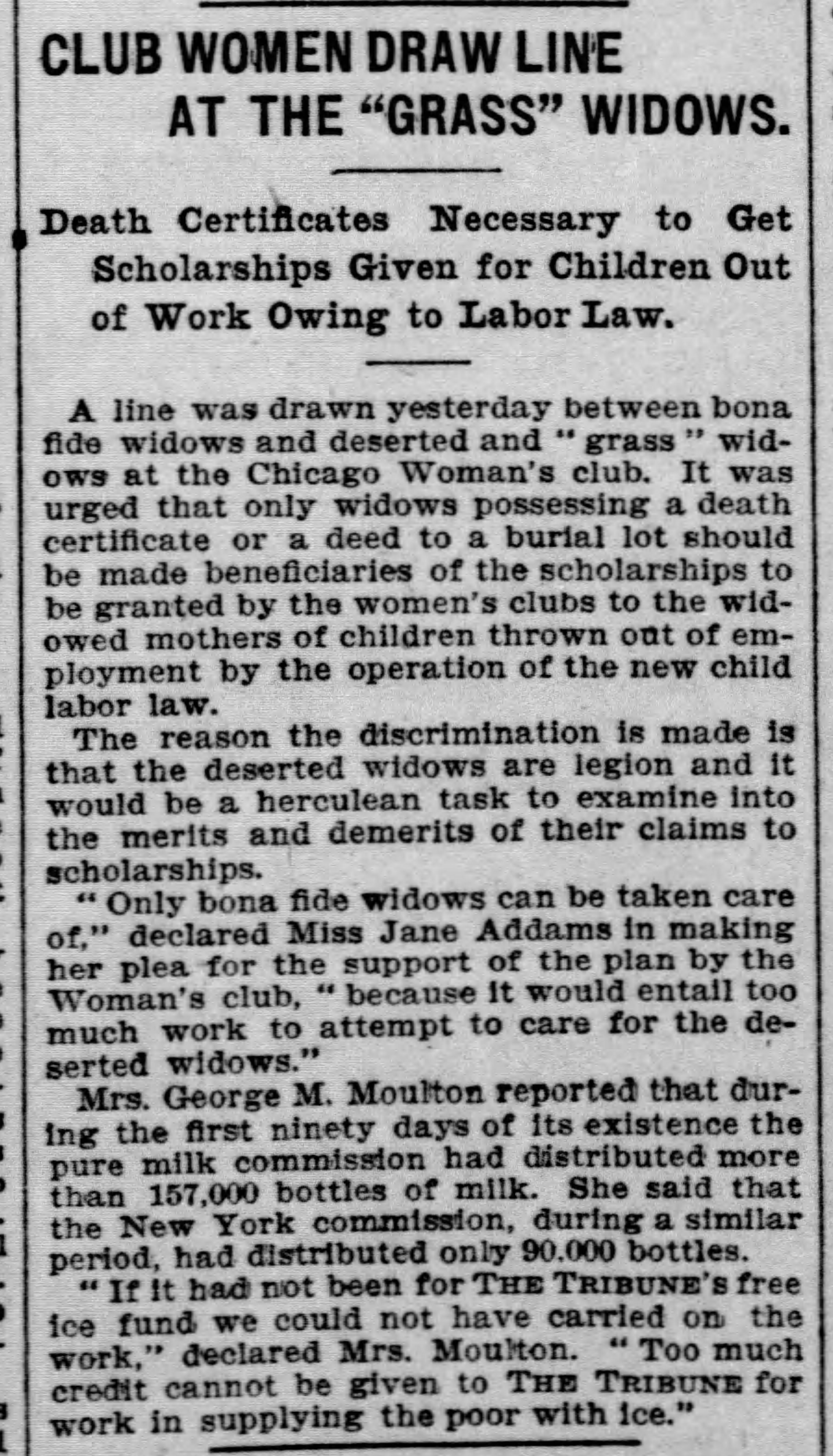 "Only bona fide widows can be taken care of," declared Miss Jane Addams in making her plea for the support of the plan by the Woman's club, "because it would entail too much work to attempt to care for the deserted widows."