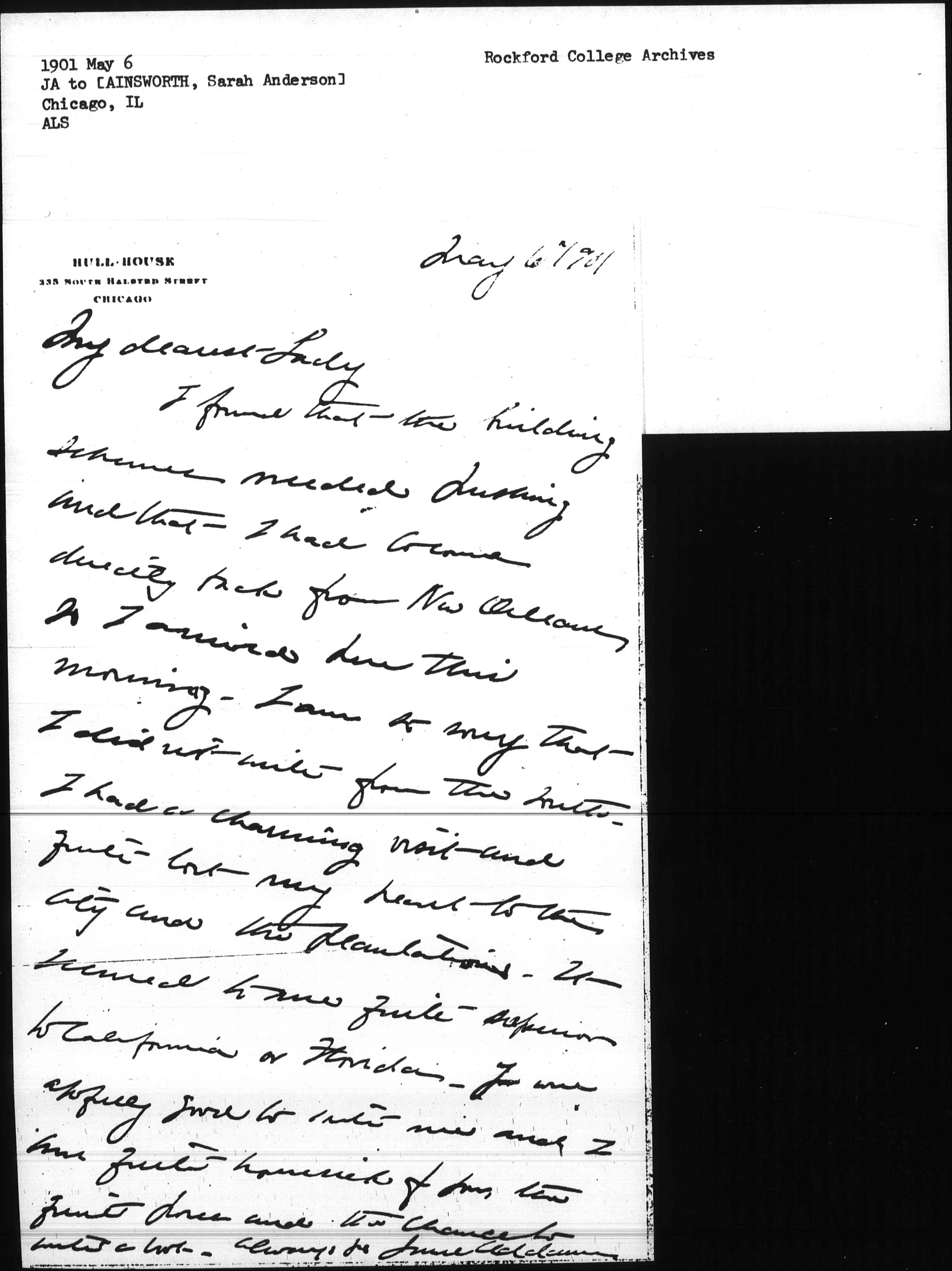I found that the building schemes needed pushing and that I had to come directly back from New Orleans so I arrived here this morning. I am so sorry that I didn't write from the South. I had a charming visit and quite lost my heart to the city and the plantations. It seemed to me quite superior to California or Florida. You were awfully good to write me and I am quite homesick for you, the quiet places and the chance to write a book. Always yrs Jane Addams