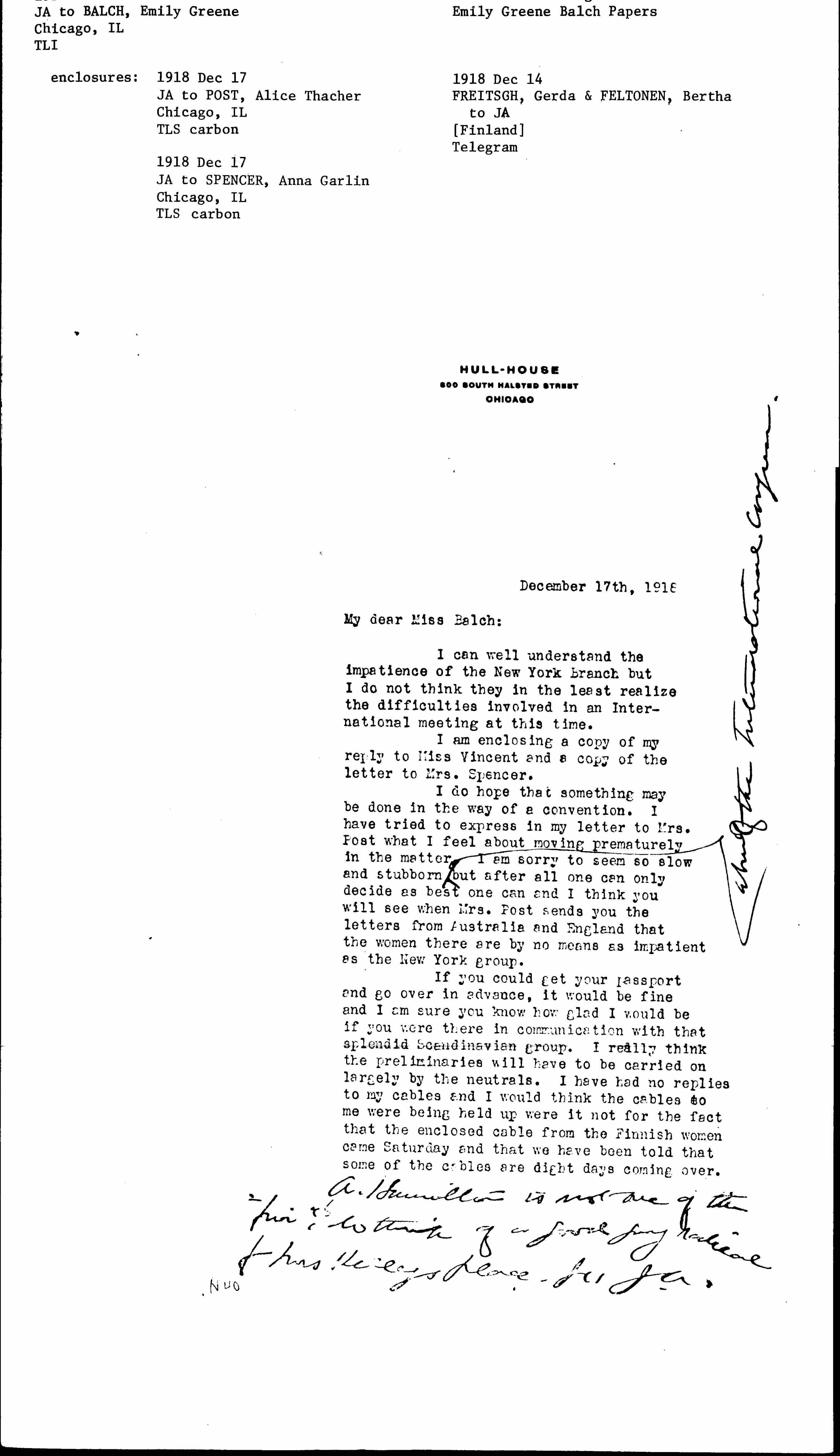 If you could get your passport and go over in advance, it would be fine and I am sure you know how glad I would be if you were there in communication with that splendid Scandinavian group. I really think the preliminaries will have to be carried on largely by the neutrals. I have had no replies to my cables and I would think the cables to me were being held up were it not for the fact that the enclosed cable from the Finnish women came Saturday and that we have been told that some of the cables are eight days coming over.