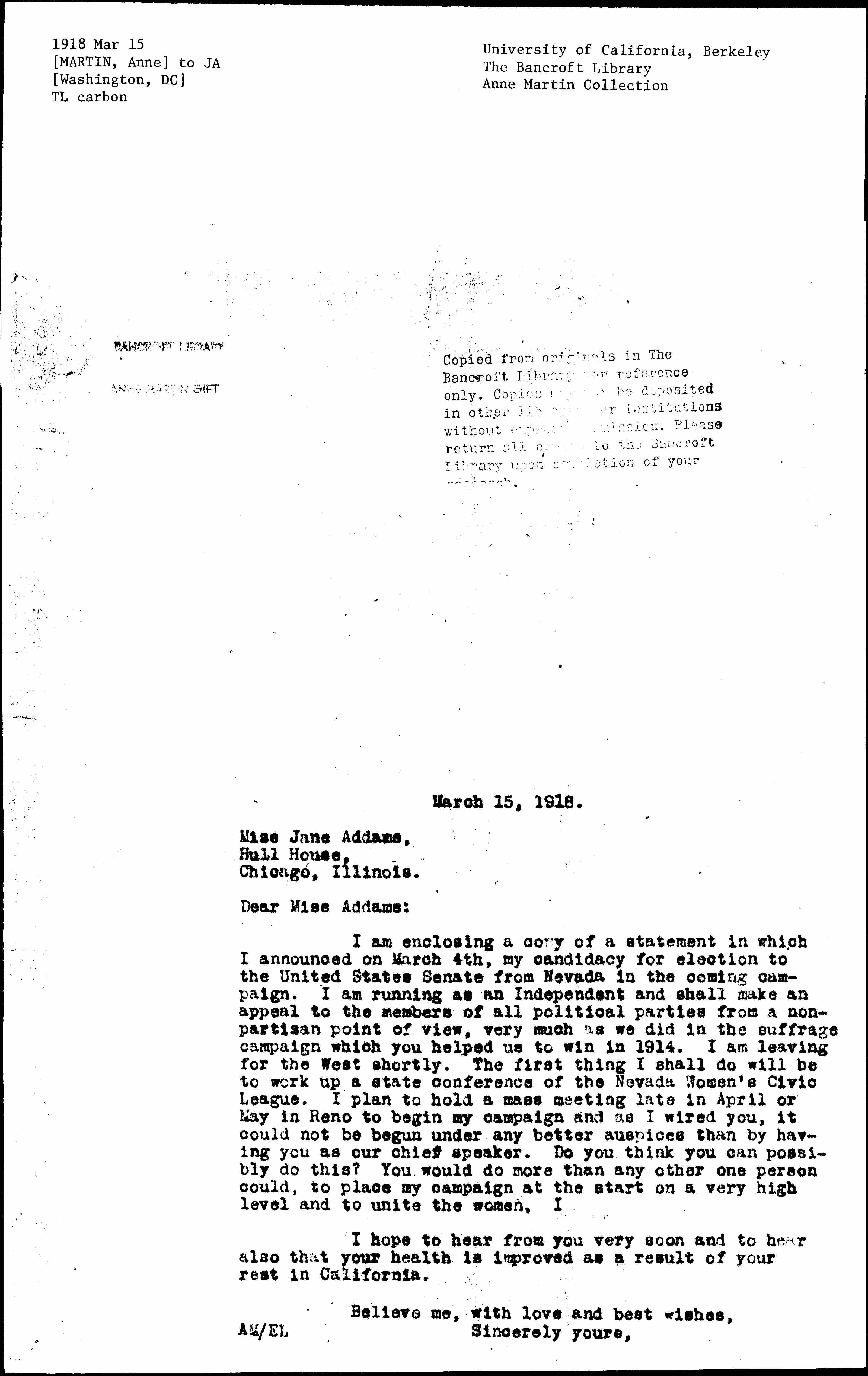 I am enclosing a copy of a statement in which I announced on March 4th, my candidacy for election to the United States Senate from Nevada in the coming campaign. I am running as an Independent and shall make an appeal to the members of all political parties from a non-partisan point of view, very much as we did in the suffrage campaign which you helped us to win in 1914. I am leaving for the West shortly. The first thing I shall do will be to work up a state conference of the Nevada Women's Civic League. I plan to hold a mass meeting late in April or May in Reno to begin my campaign and as I wired you, it could not be begun under any better auspices than by having you as our chief speaker. Do you think you can possibly do this? You would do more than any other one person could, to place my campaign at the start on a very high level and to unite the women.