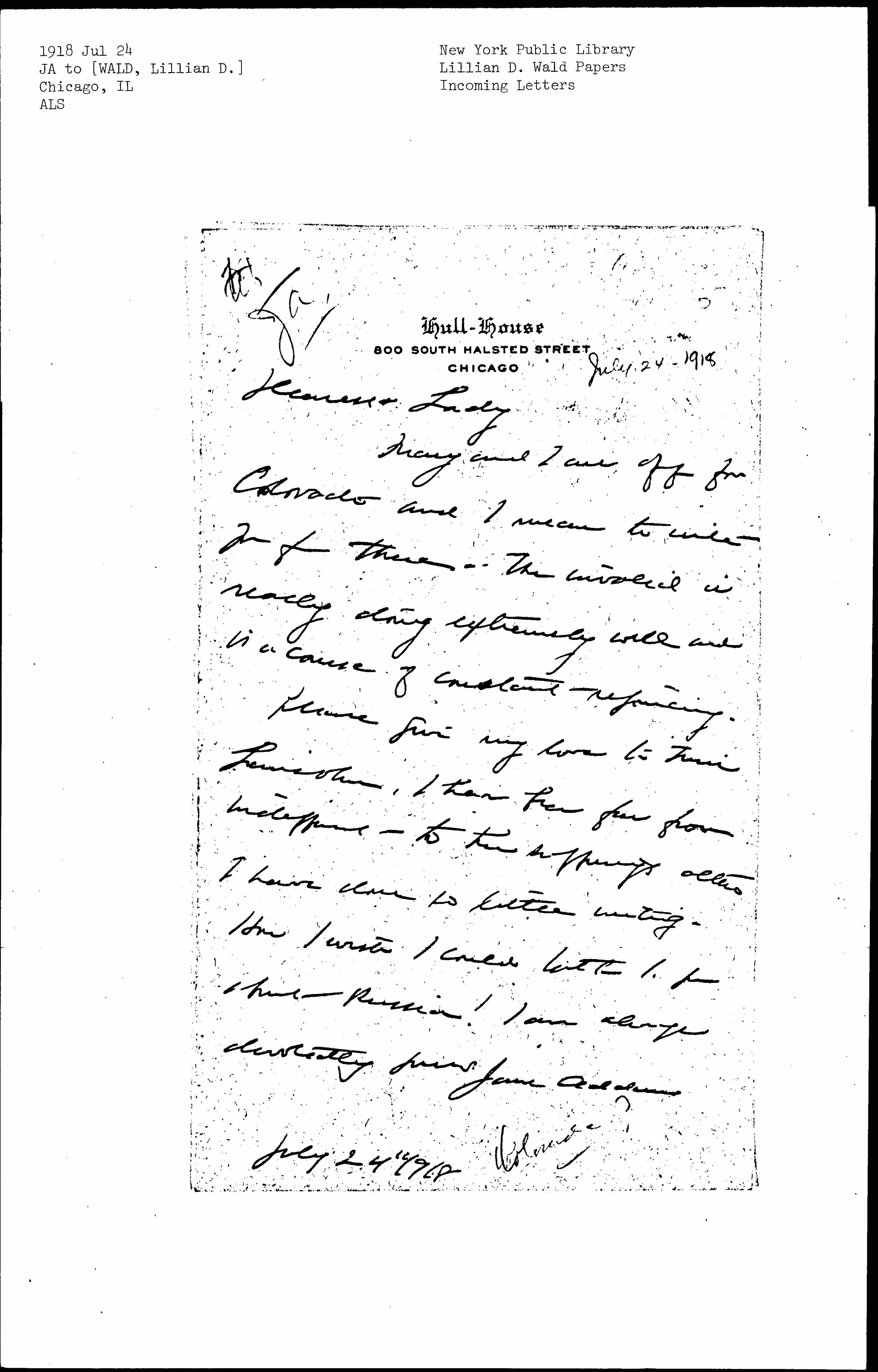 Please give my love to Miss Lewisohn, I have been far from indifferent to her sufferings [although] I have done so little writing. How I wish I could talk to you about Russia! I am always devotedly yours Jane Addams