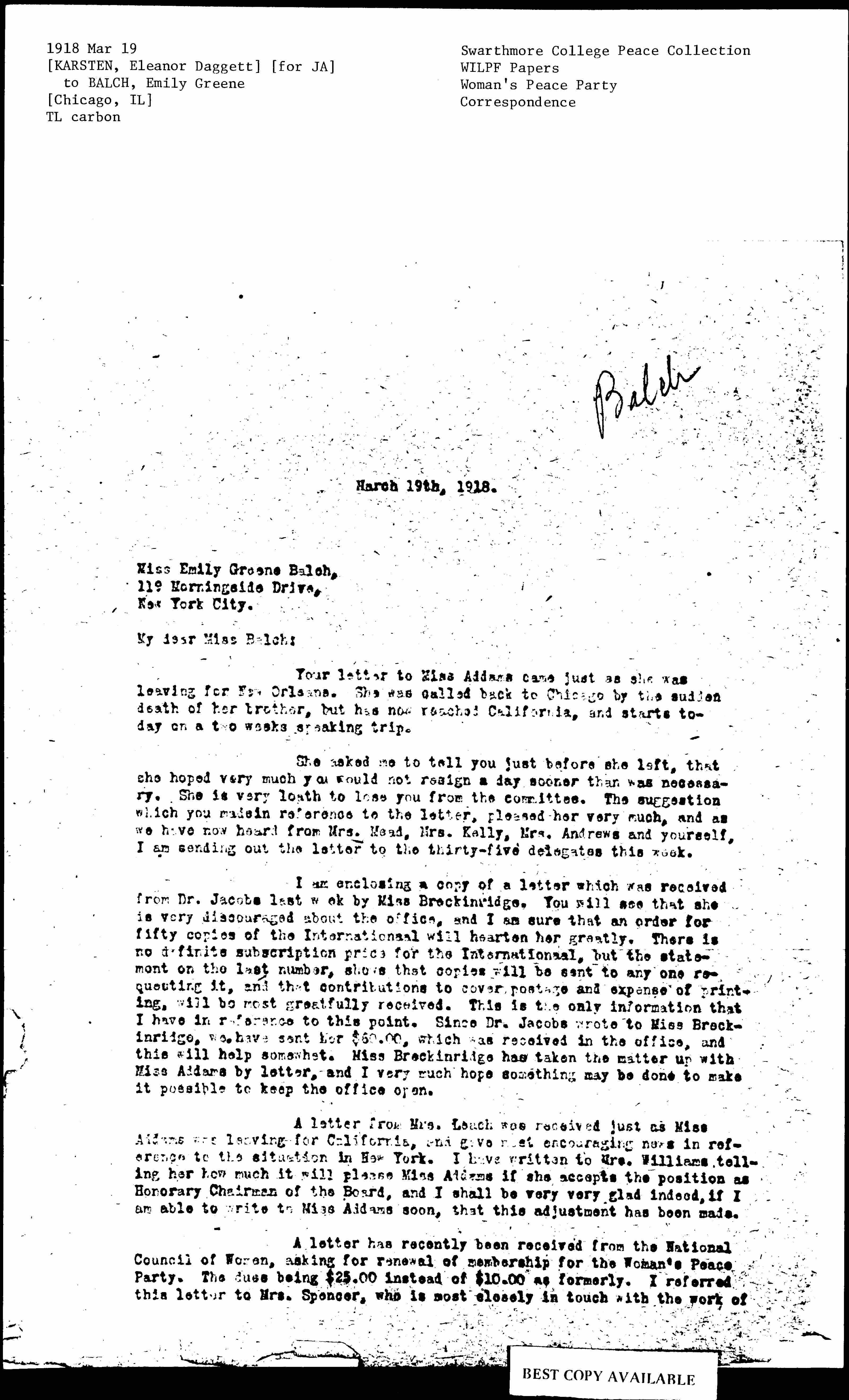 My dear Miss Balch: