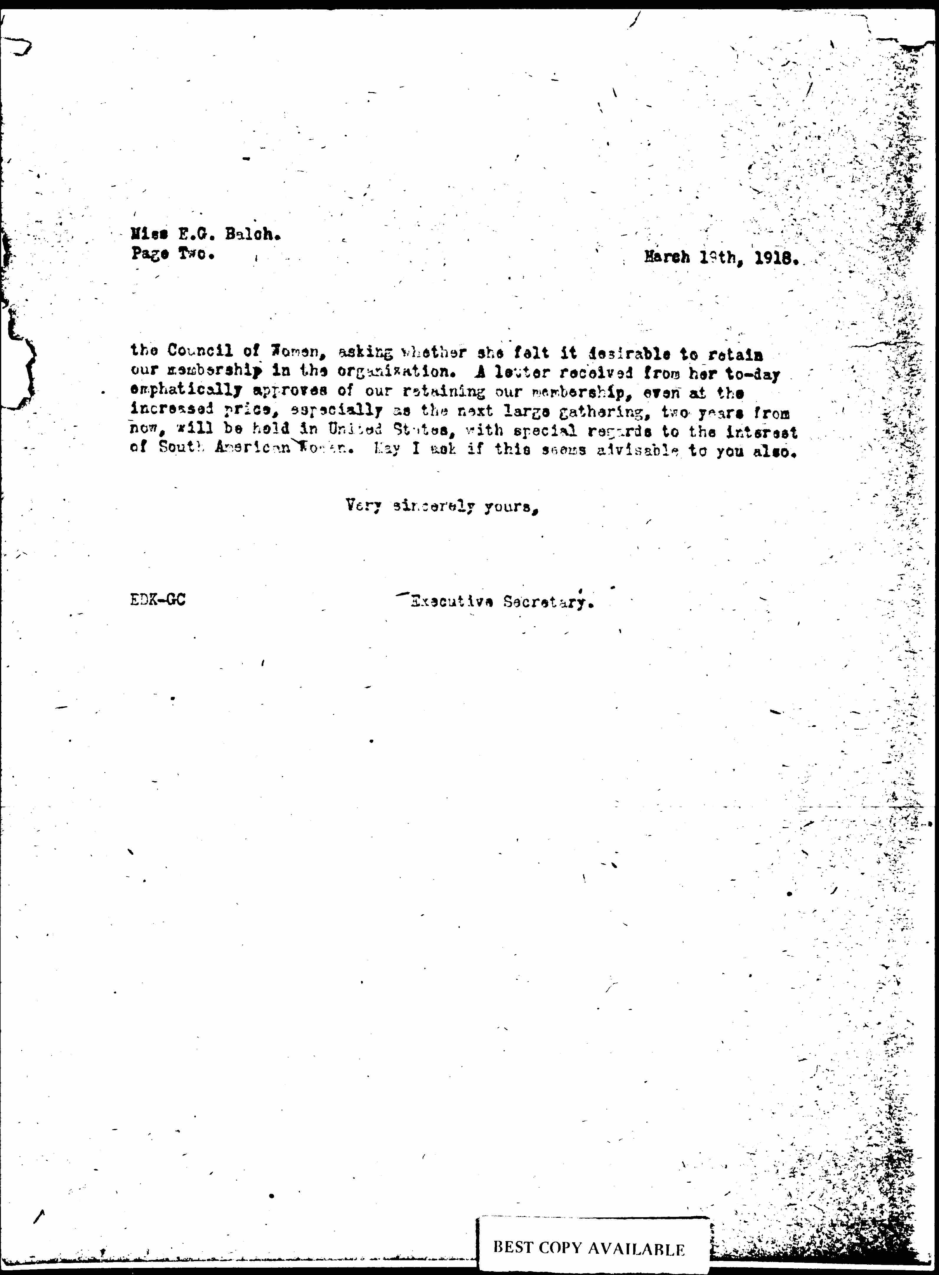 A letter has recently been received from the National Council of Women, asking for renewal of membership for the Woman's Peace Party. The dues being $25.00 instead of $10.00 as formerly. I referred this letter to Mrs. Spencer, who is most closely in touch with the work of [page 2] the Council of Women, asking whether she felt it desirable to retain our membership in the organization. A letter received from her [today] emphatically approves of our retaining our membership, even at the increased price, especially as the next large gathering, two years from now, will be held in United States, with special regards to the interest of South American Women. May I ask if this seems advisable to you also.