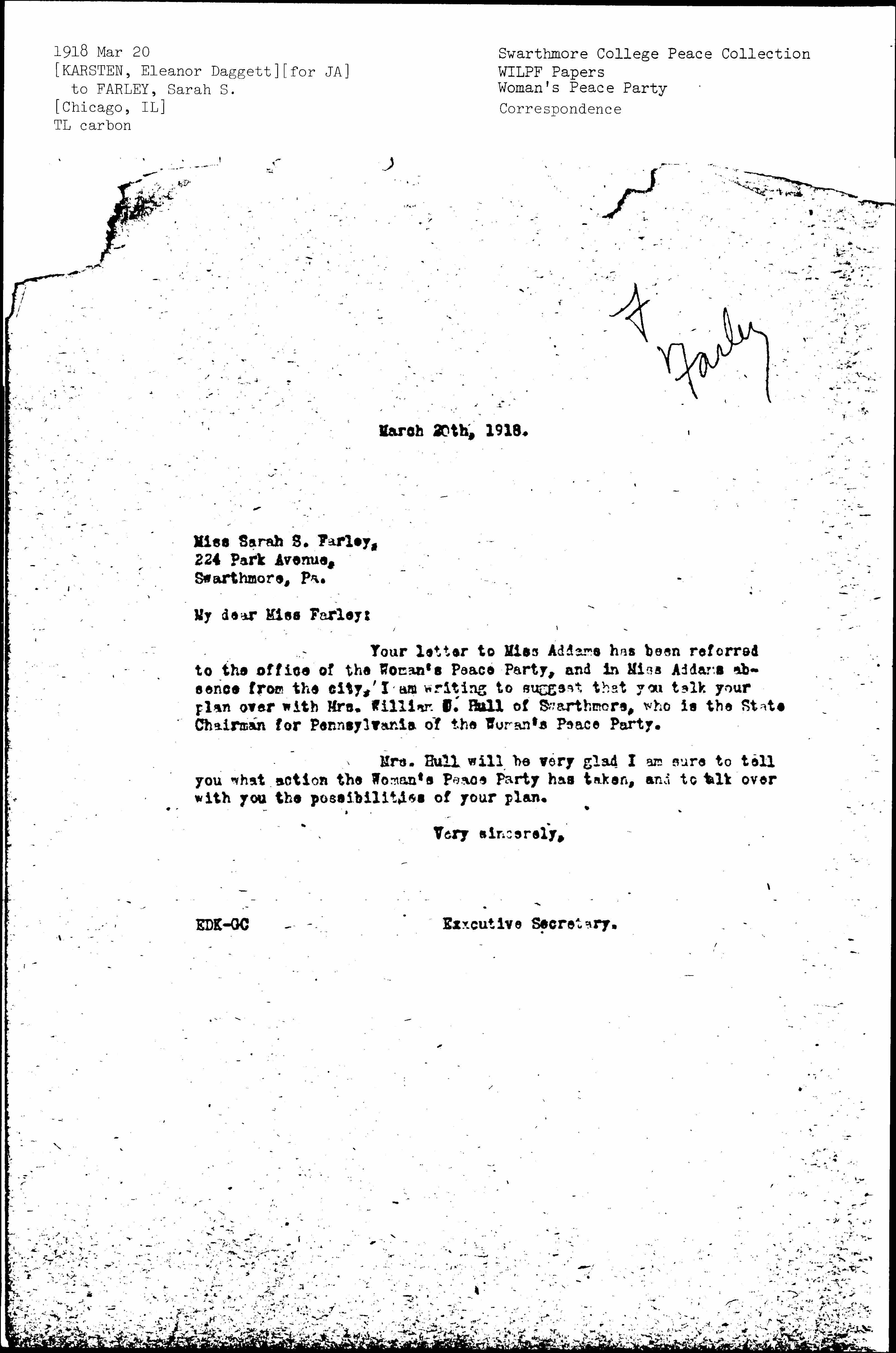 Your letter to Miss Addams has been referred to the office of the Woman's Peace Party, and in Miss Addams absence from the city, I am writing to suggest that you talk your plan over with Mrs. William I. Hull of Swarthmore, who is the State Chairman for Pennsylvania of the Woman's Peace Party.
