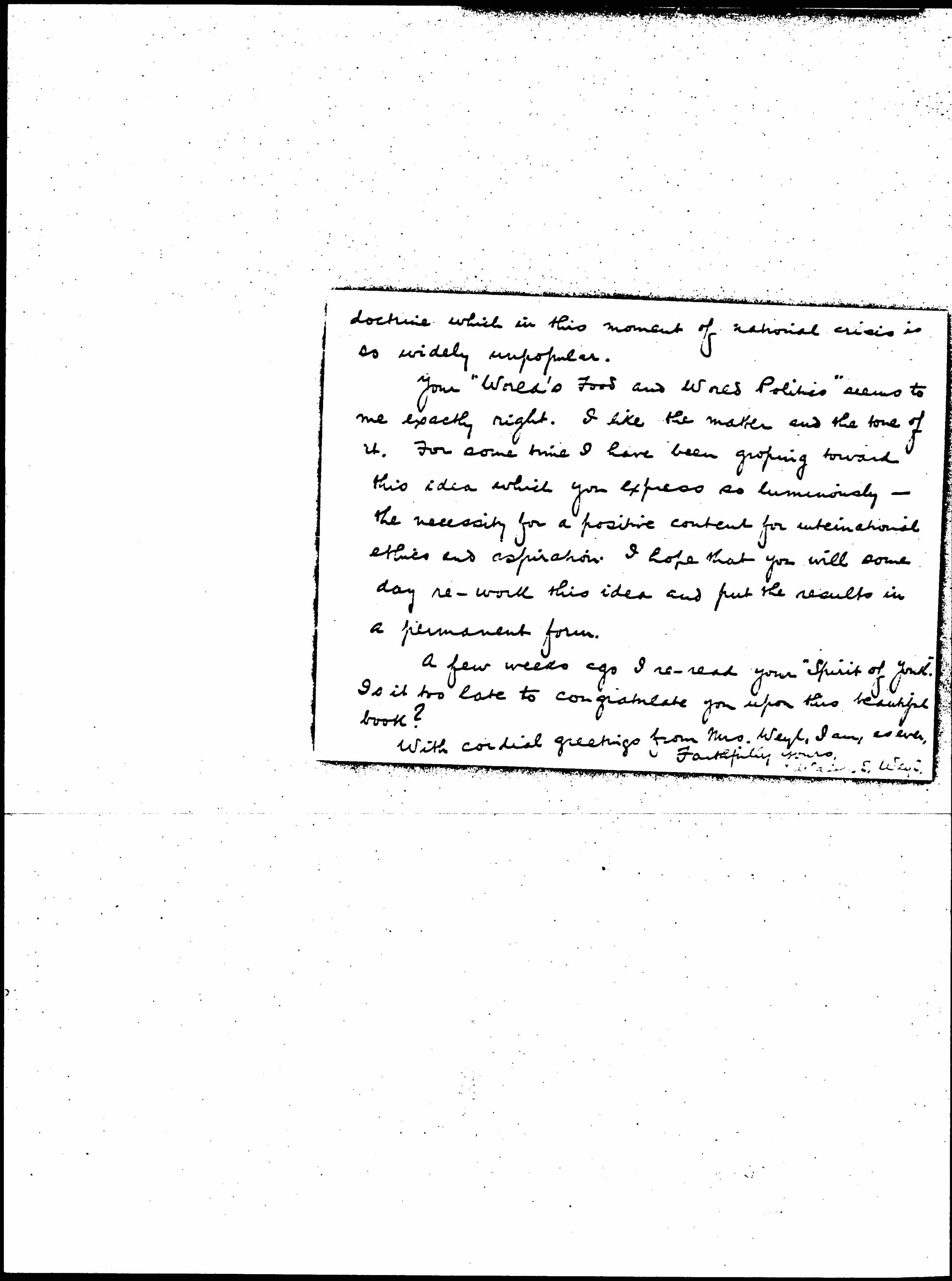 Your "World's Food and World Politics" seems to me exactly right. I like the matter and the tone of it. For some time I have been groping toward this idea which you express so luminously -- the necessity for a positive content for international ethics and aspiration. I hope that you will some day [rework] this idea and put the results in a permanent form.