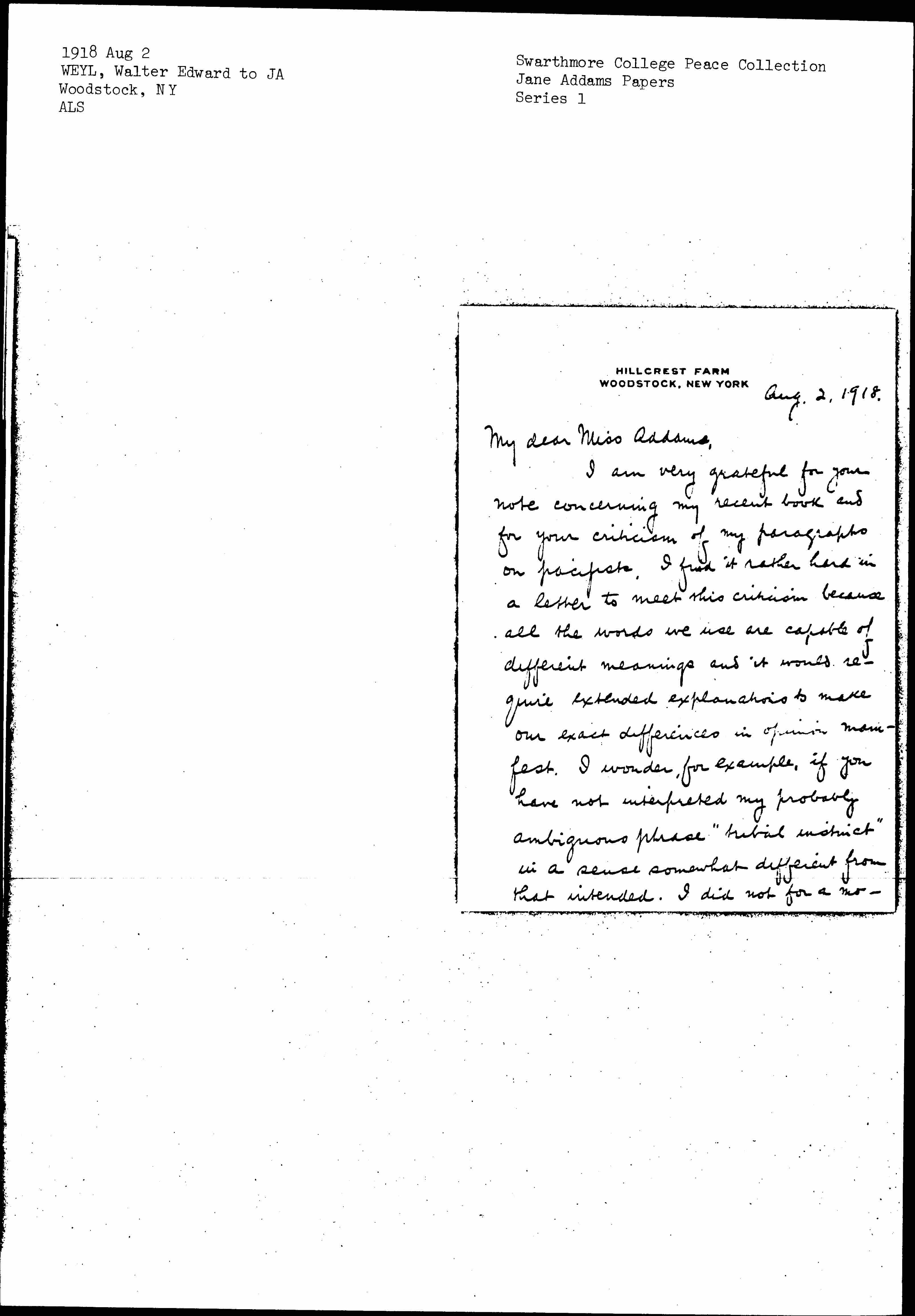 I am very grateful for your note concerning my recent book and for your criticism of my paragraphs on pacifists. I find it rather hard in a letter to meet this criticism because all the words we use are capable of different meanings and it would require extended explanations to make our exact differences in opinion manifest. I wonder, for example, if you have not interpreted my probably ambiguous phrase "tribal instinct" in a sense somewhat different from that intended. I did not for a moment [page 2] mean to imply that the pacifist was lacking in a sincere and reasoned patriotism, in a desire to advance his nation while promoting the general welfare of the world. What I had in mind was something more instinctive, the immediate response to an overpowering herd-impulse, the tendency always to think your tribe right even if it is, in reality, brutal, greedy and predacious. Perhaps we still disagree on this point. However, while I do not claim to share your deep convictions concerning [nonresistance] I hope that you will believe that I respect them sincerely and I am sure that you will acquit me of the wish to take an easy fling at a [page 3] doctrine while in this moment of national crisis is so widely unpopular.