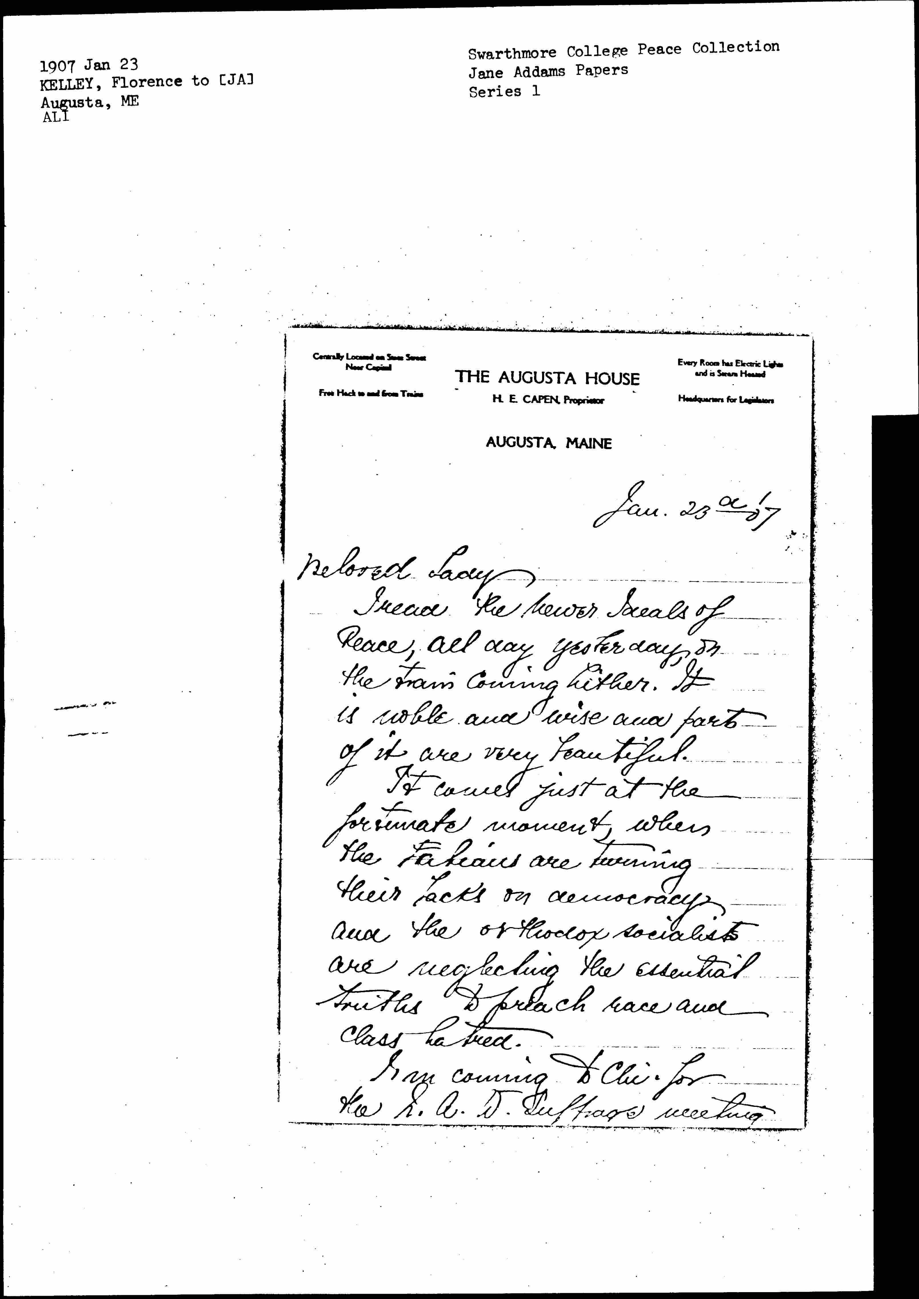 I'm coming to Chi. for the N. A. W. Suffrage meeting. [page 2] Of course, I'm coming to H.–H. But I'm well and hearty once more, and have no possible excuse for occupying your room. So please let me have what we used to call the sleeping car on the third floor, or anything else that cames handy.