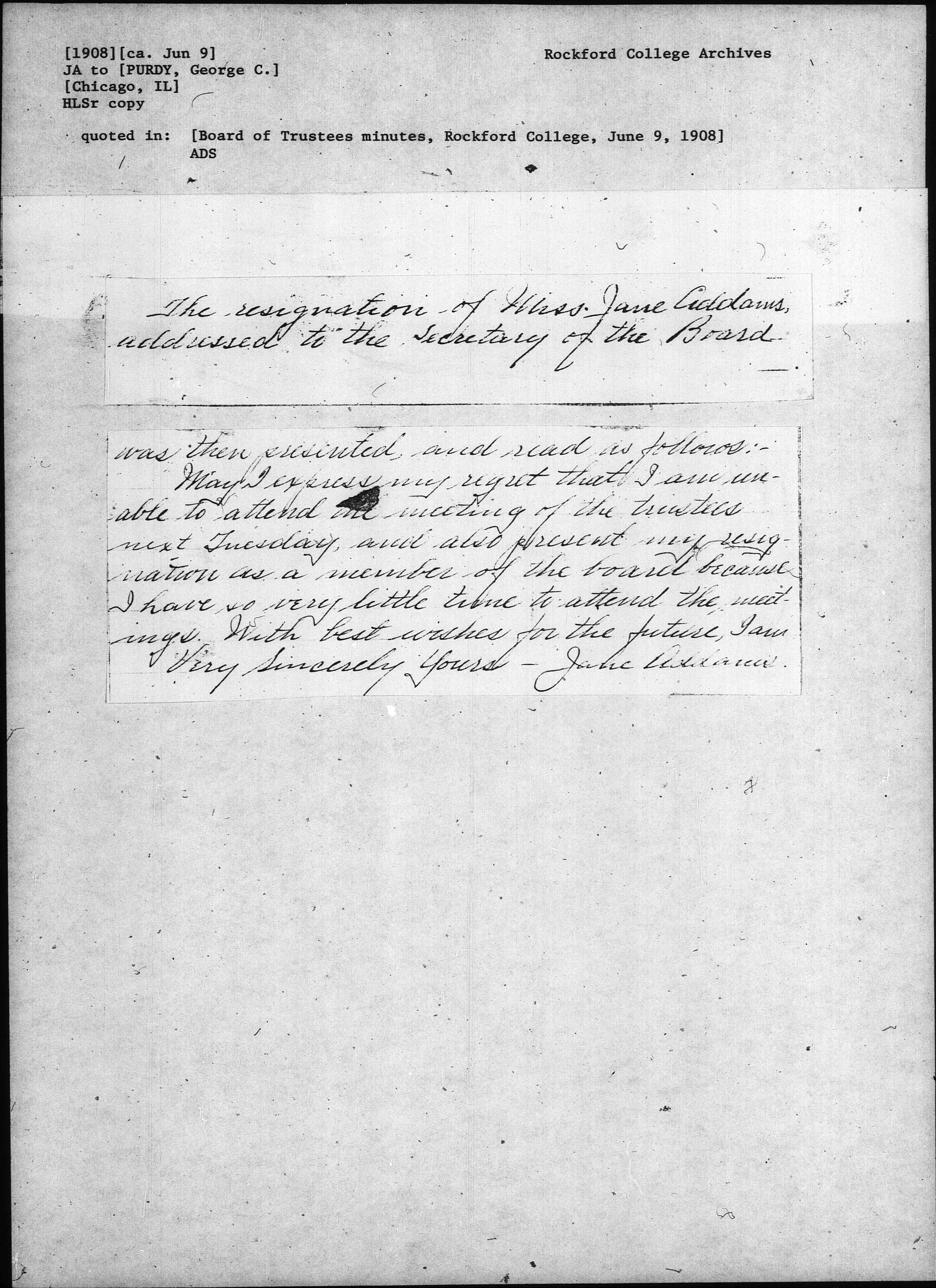 Very Sincerely Yours -- Jane Addams.