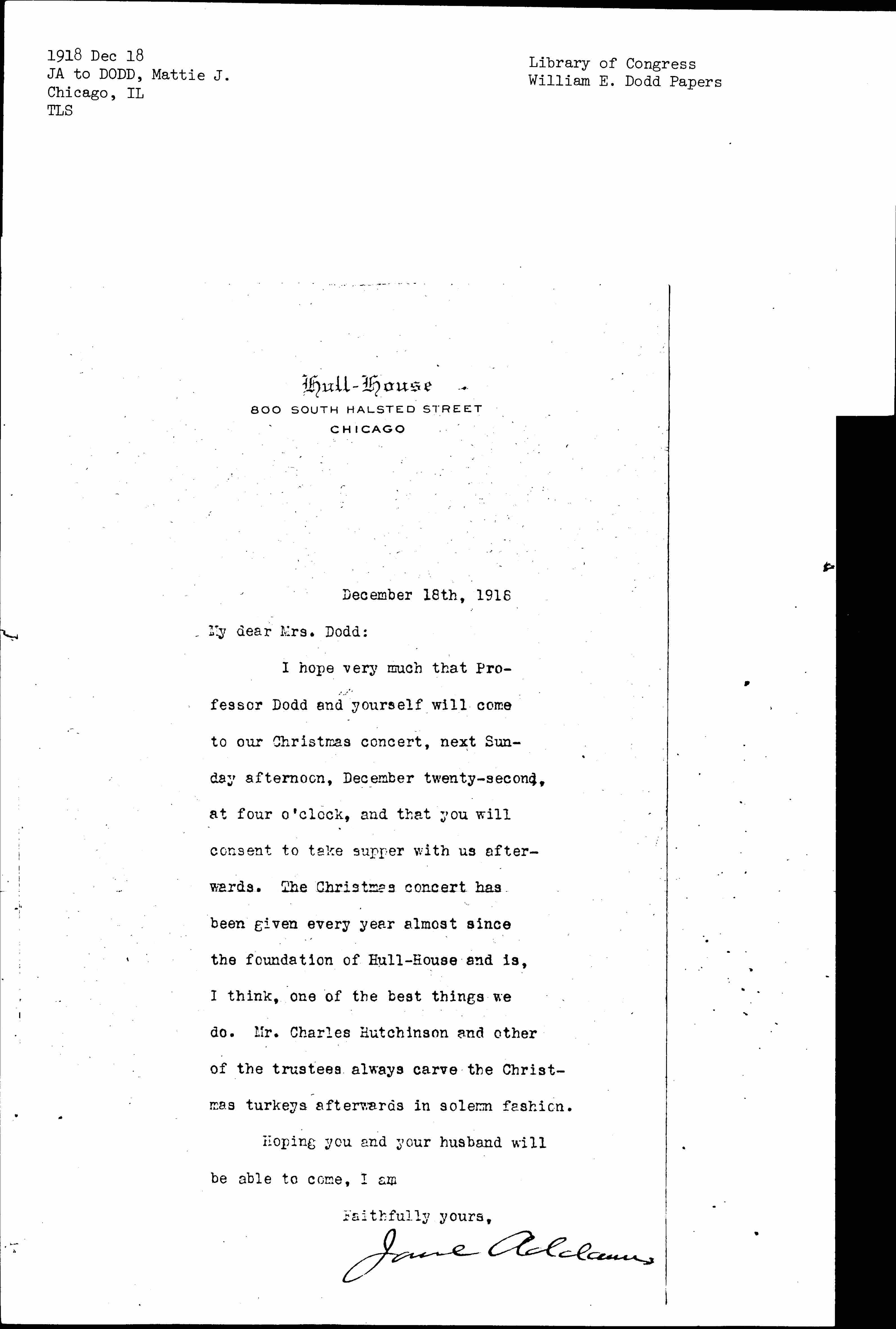 I hope very much that Professor Dodd and yourself will come to our Christmas concert, next Sunday afternoon, December twenty-second, at four o'clock, and that you will consent to take supper with us afterwards. The Christmas concert has been given every year almost since the foundation of Hull-House and is, I think, one of the best things we do. Mr. Charles Hutchinson and other of the trustees always carve the Christmas turkeys afterwards in solemn fashion.