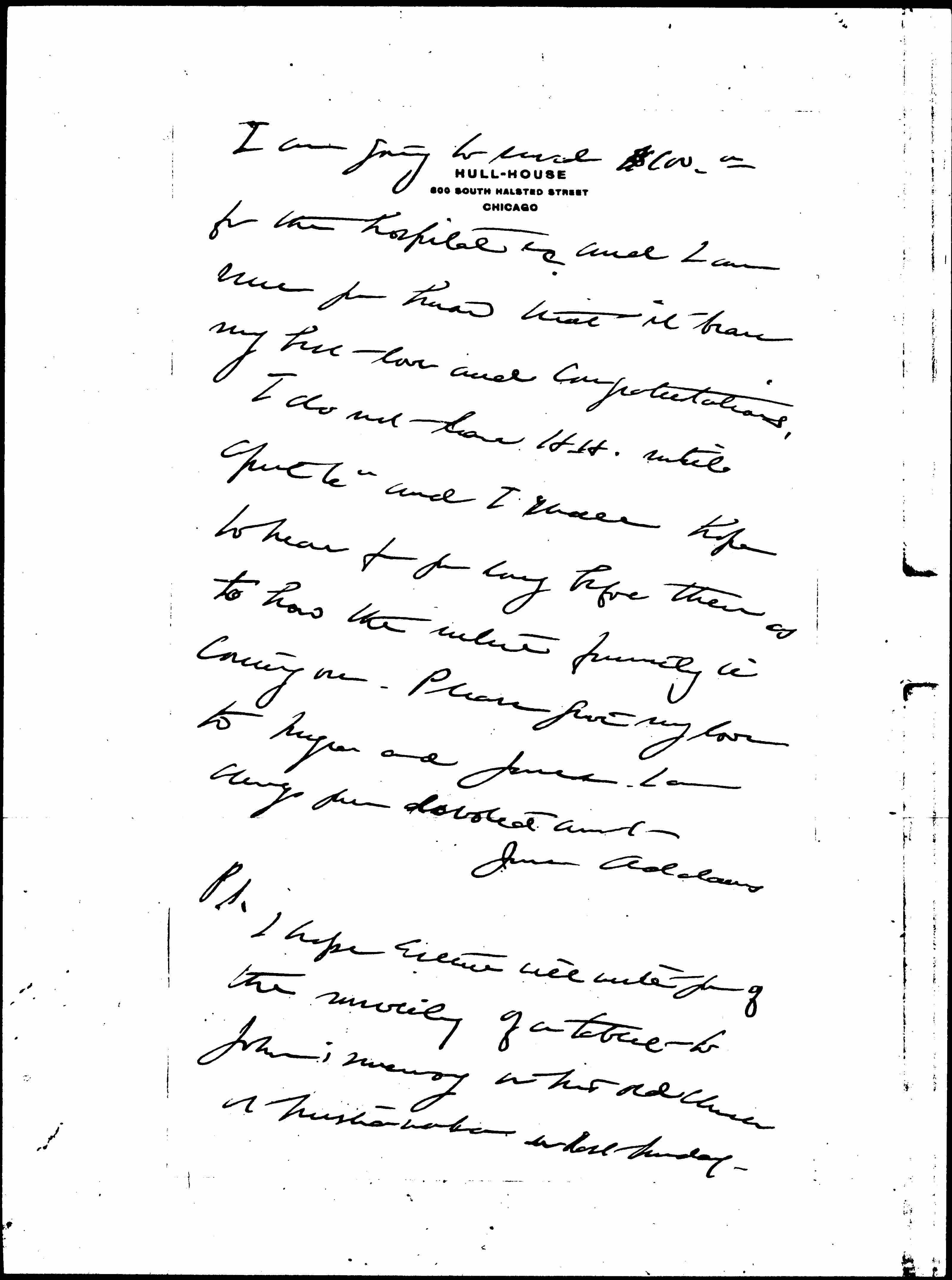 I haven't heard from you for about a week and I hope that it means that Myra is doing well and that the immediate difficulty is over. [page 2] I am going to send $100.00 for the hospital [etc] and I am sure you know that it bears my best love and congratulations.