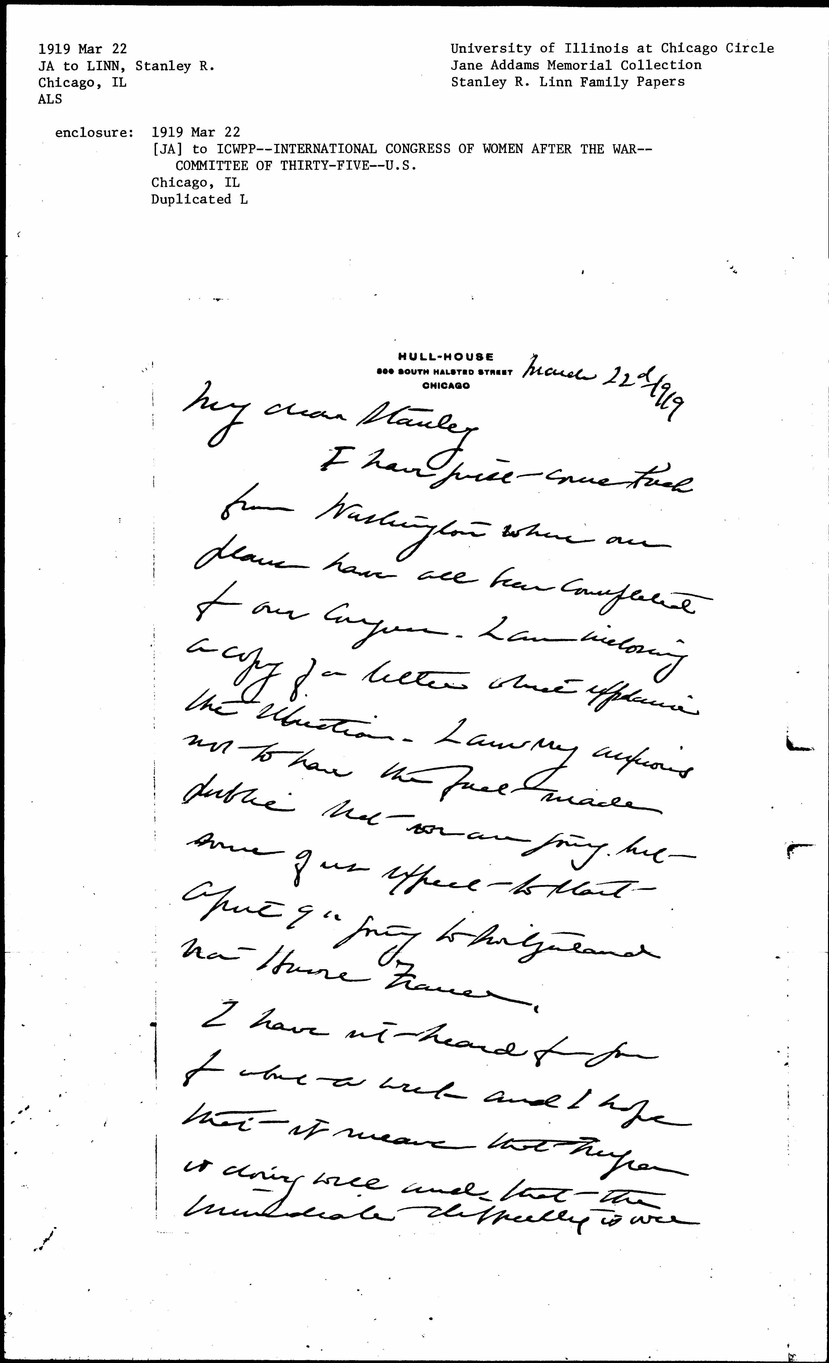 I have just come back from Washington where our plans have all been completed for our Congress. I am [enclosing] a copy of a letter which explains the situation. I am very anxious not to have the fact made public that we are going but some of us expect to start April 9" going to Switzerland via Havre France.