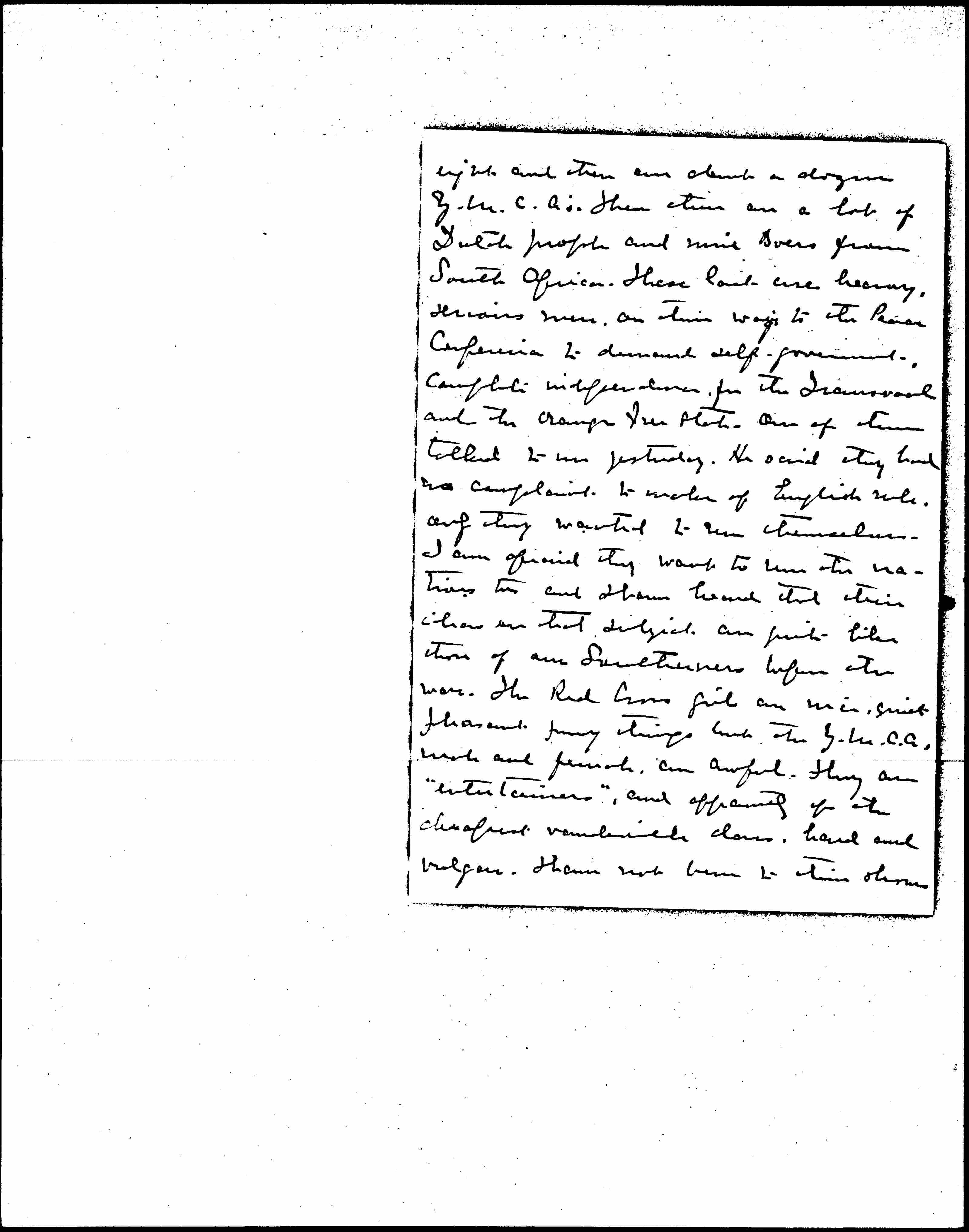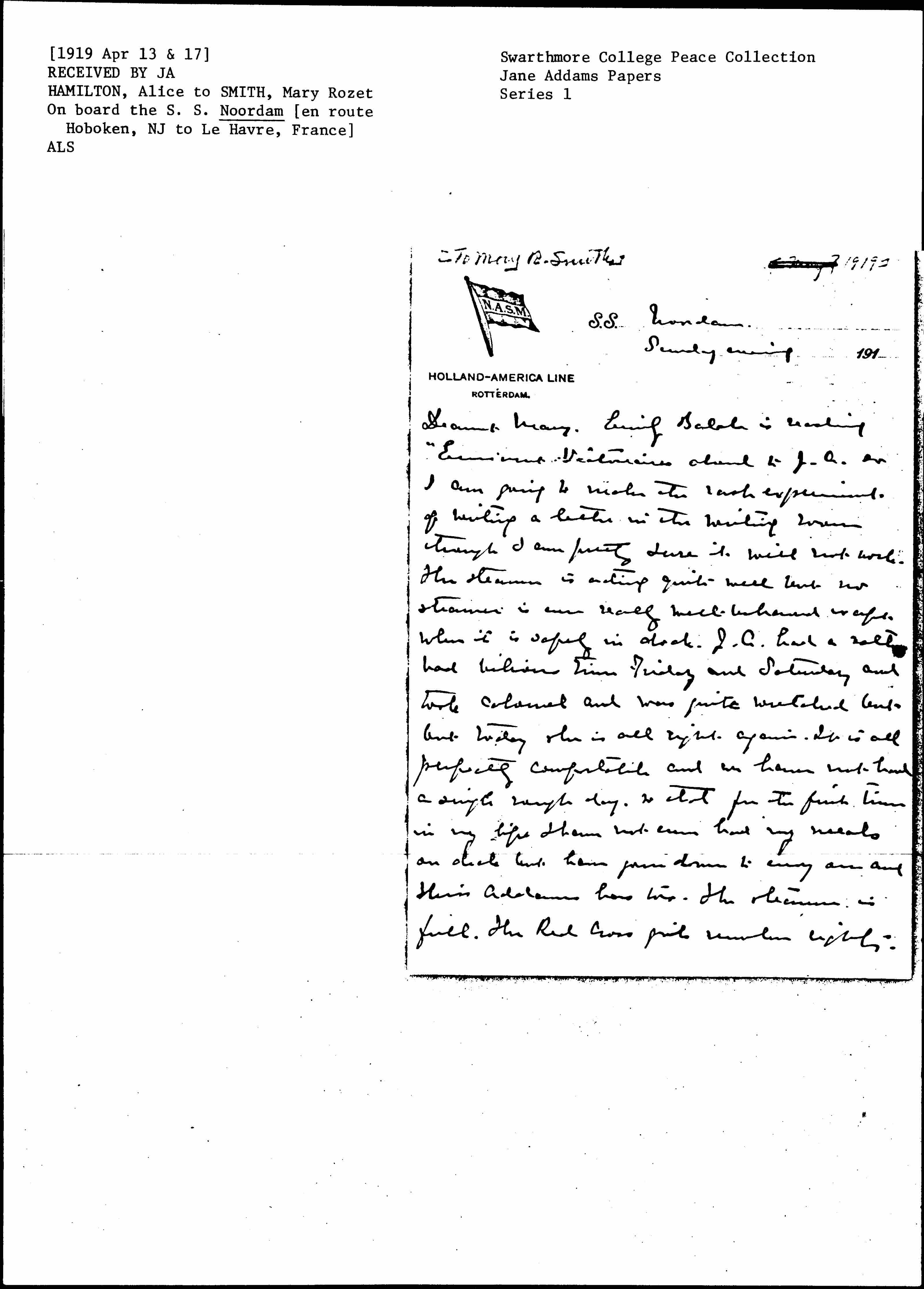 Dearest Mary, Emily Balch is reading "Eminent Victorians" aloud to J. A. so I am going to make the rash experiment of writing a letter in the writing room though I am pretty sure it will not work. The steamer is acting quite well but no steamer is ever really well-behaved except when it is safely in dock. J. A. had a [rather] bad bilious time Friday and Saturday and took calomel and was quite wretched but today she is all right again. It is all perfectly comfortable and we have not had a single rough day, so that for the first time in my life I have not even had my meals on deck but have gone down to every one and Miss Addams has too. The steamer is full. The Red Cross girls number eighty -- [page 2] eight and there are about a dozen Y.M.C.A.s. Then there are a lot of Dutch people and nine Boers from South Africa. These last are heavy, serious men, on their way to the Peace Conference to demand self-government, complete independence for the Transvaal and the Orange Free State. One of them talked to me yesterday. He said they had no complaint to make of English rule, only thing wanted to run themselves. I am afraid they want to run the natives too and I have heard that their ideas on that subject are quite like those of our Southerners before the war. The Red Cross girls are nice, quiet pleasant young things but the Y.M.C.A.s, male and female, are awful. They are "entertainers", and apparently of the cheapest vaudeville class, hard and vulgar. I have not been to their shows [page 3] in the evening but the people who have are quite sick to think that Y.M.C.A. money is being spent to send stuff like that way across the ocean to our soldiers. And they have the expensive cabins while the Red Cross girls are three in a room as our floor ↑deck.↓